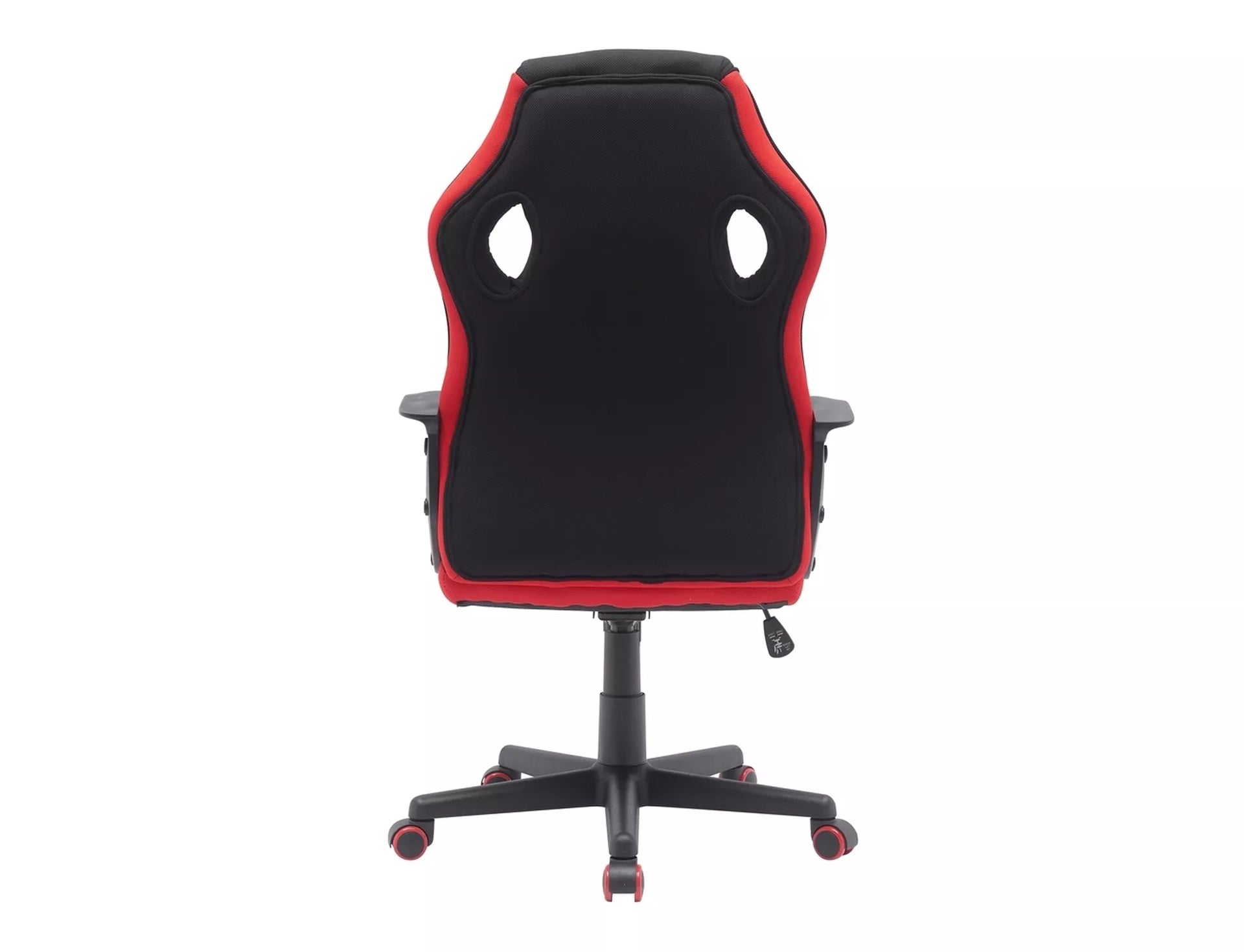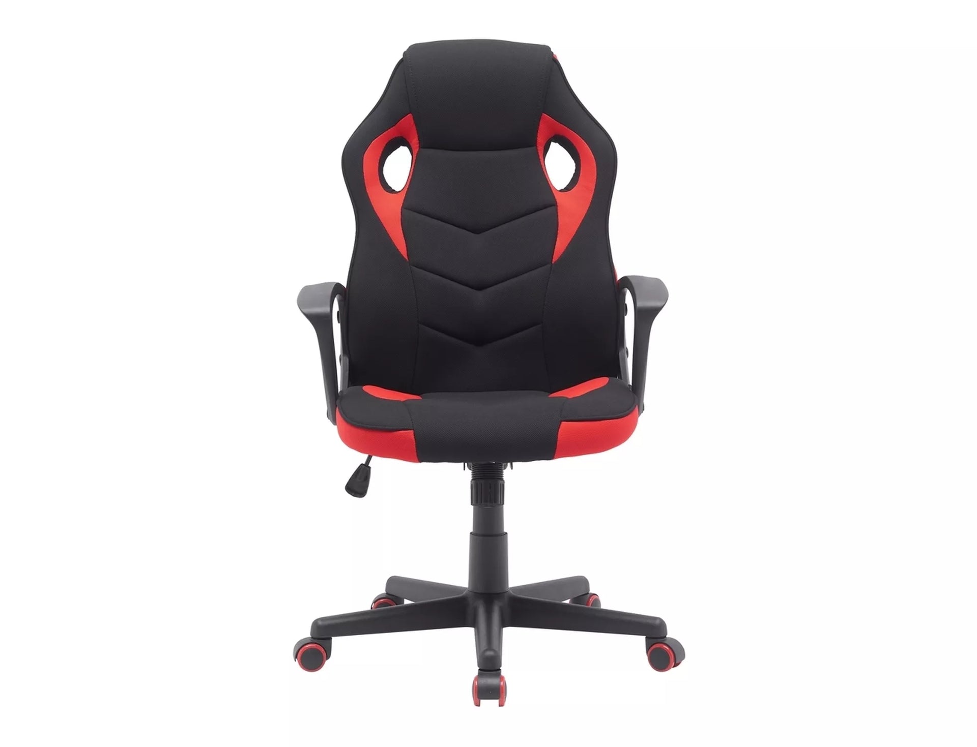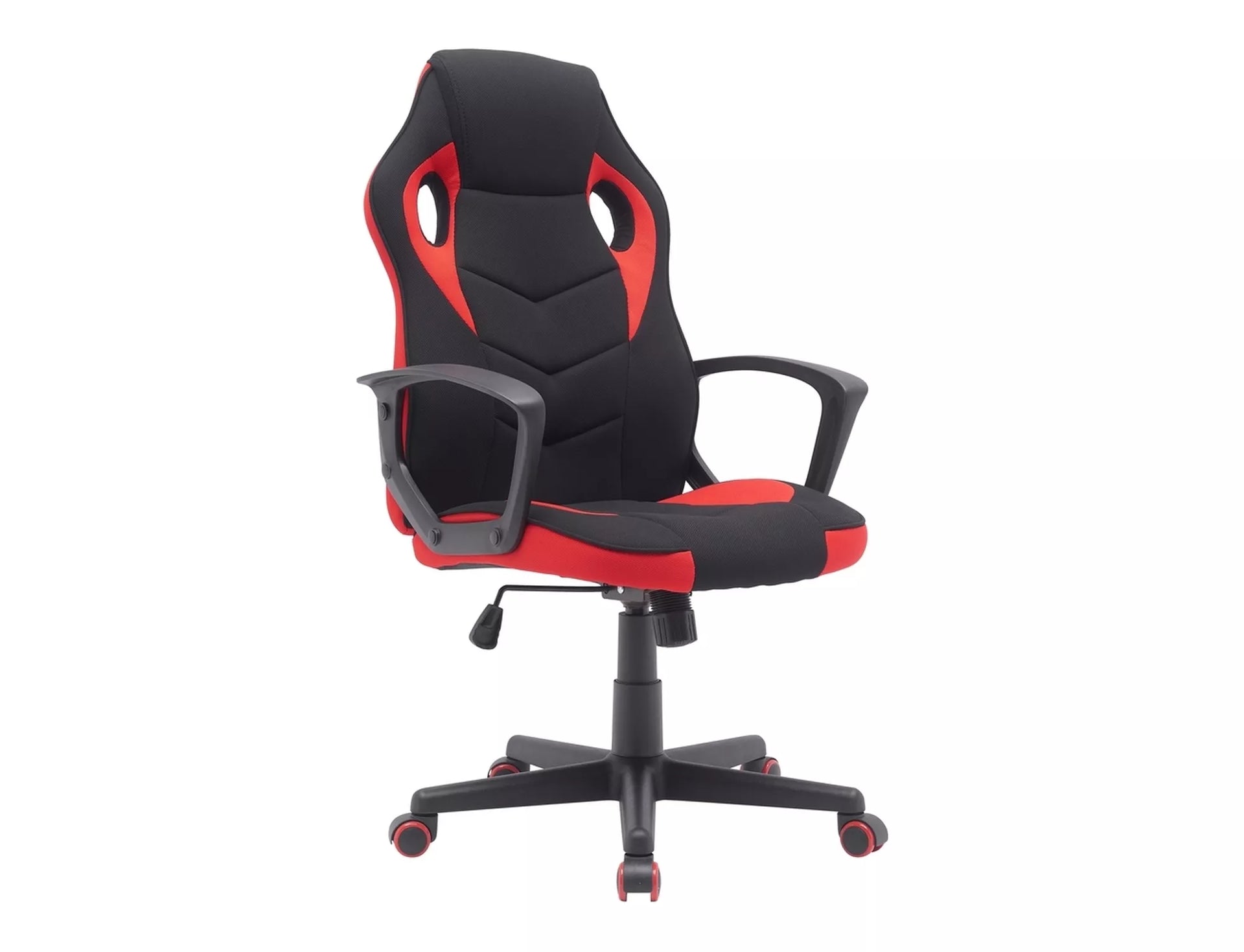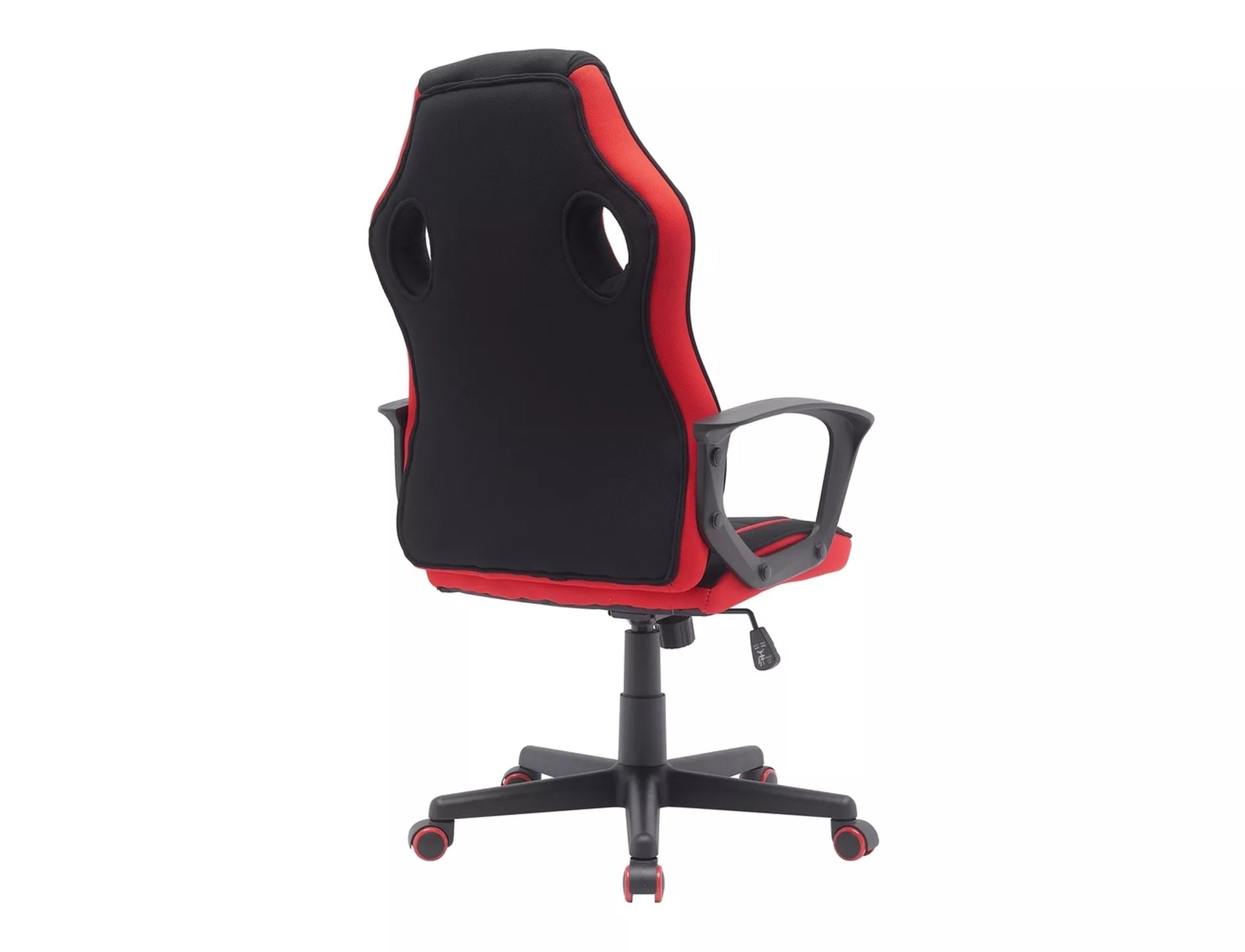 Fotoliu pivotant, stofa, culoare: negru/rosu, material cadru: negru, mecanism TILT, cotiere fixe, roti cauciuc, sarcina maxima 120 kg.