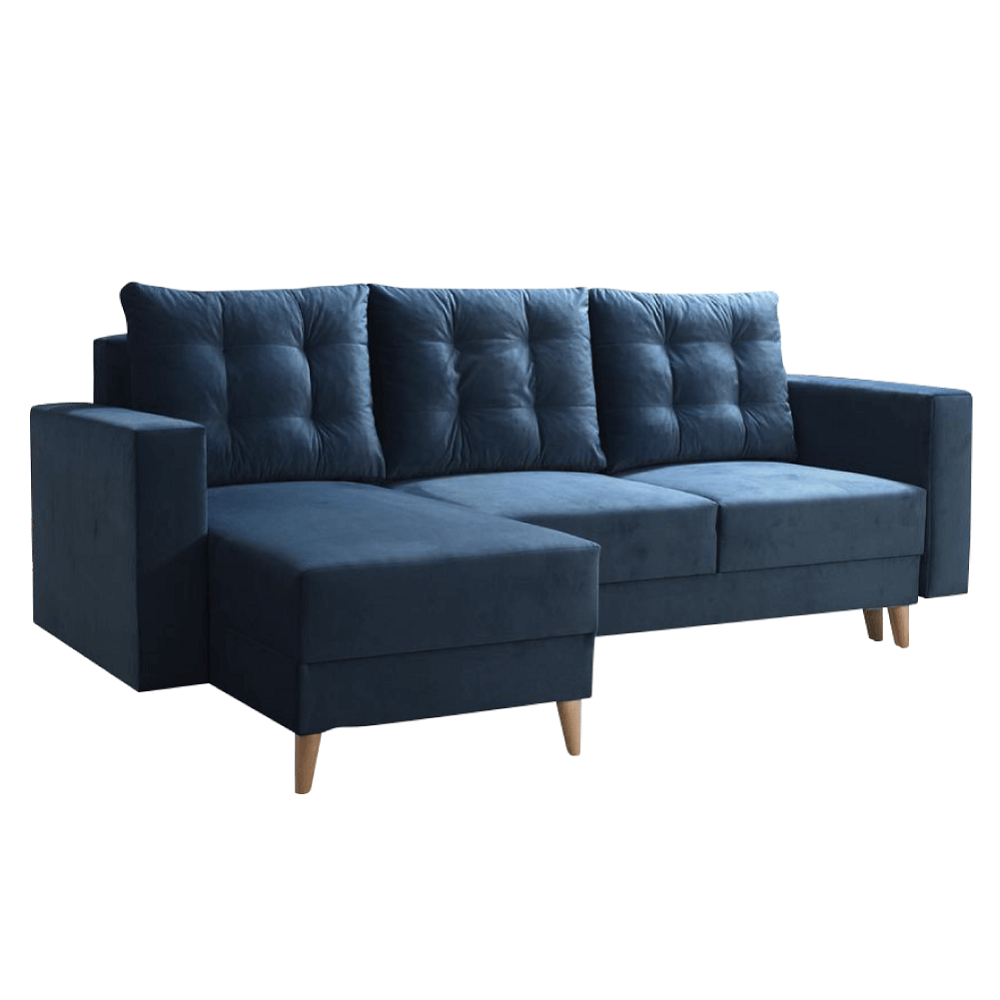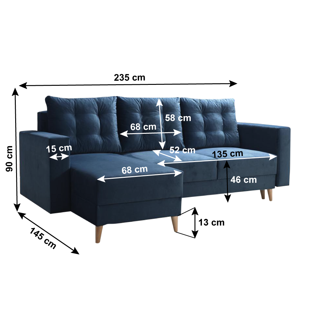 Material tapiţerie: ţesătură Kronos 9 Rezistenţa la frecare a ţesăturii conform testului Martindale: 60.000 Culoare tapiţerie: albastră Dimensiuni (LxAxÎ): 235x145x90 cm Suprafaţa pentru dormit (LxL): 130x200 cm Înălţime scaun: 46 cm Adâncime scaun: 52 cm Lăţime otoman: 68 cm Lăţime scaun: 135 cm Lăţime cotieră: 15 cm Înălţimea compartimentului inferior de la podea: 13 cm Cu picioare de lemn Culoare picioare: fag Capacitate de susţinere per persoană: 90 kg Umplutura: arcuri ondulate + spumă poliuretanică, 3 perne incluse în set, Dimensiuni perne (LxL): 68x58 cm Colţar extensibil, Tapiţat integral, Cu spaţiu de depozitare, Stânga, Livrat dezasamblat