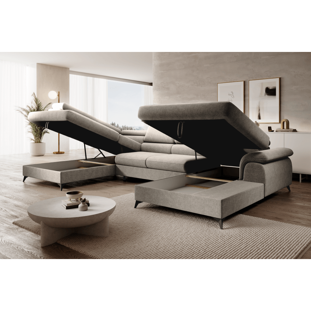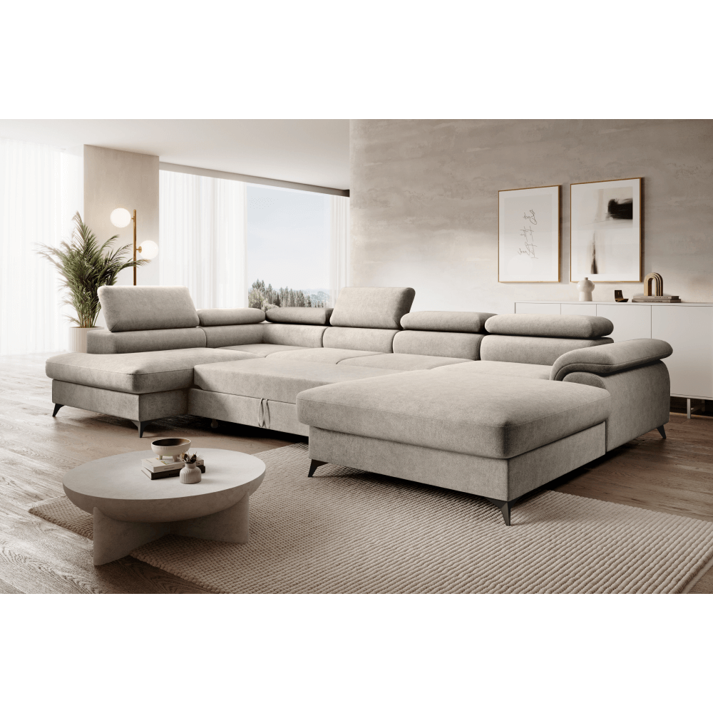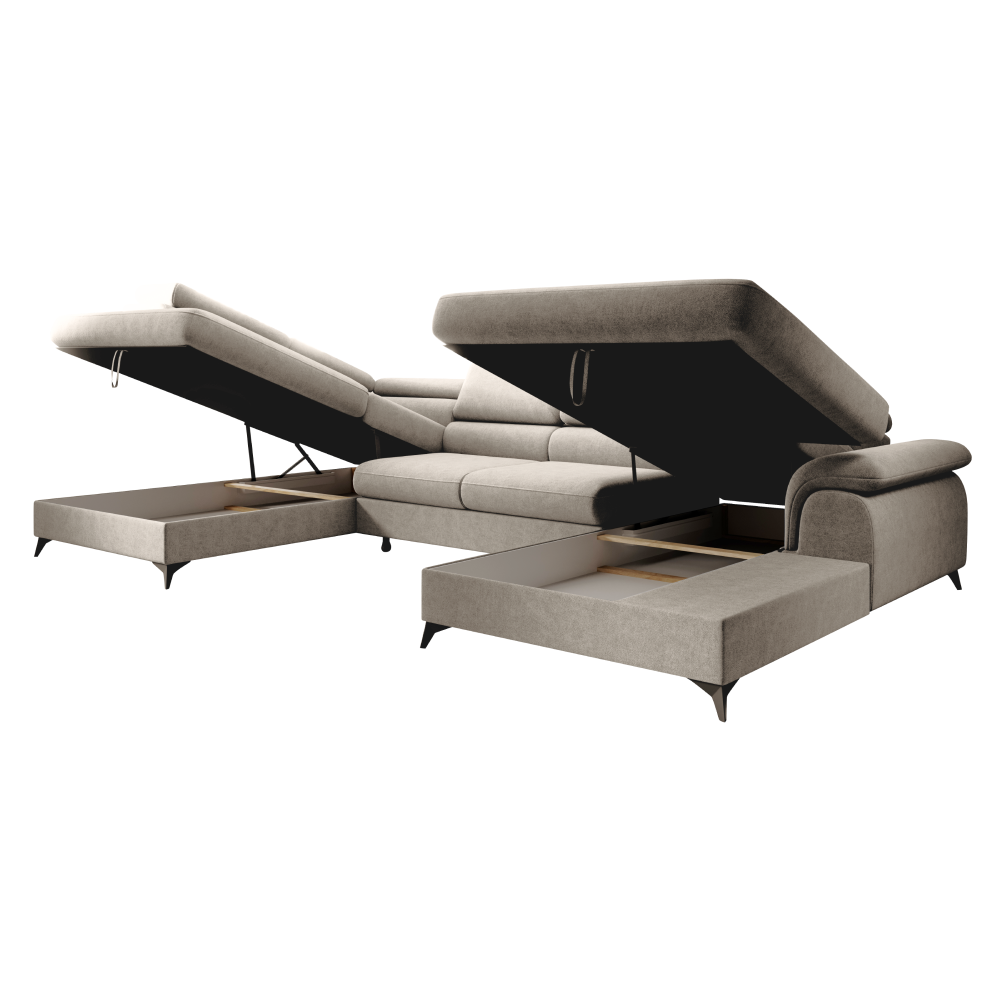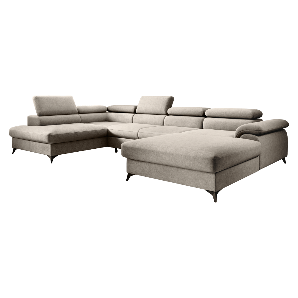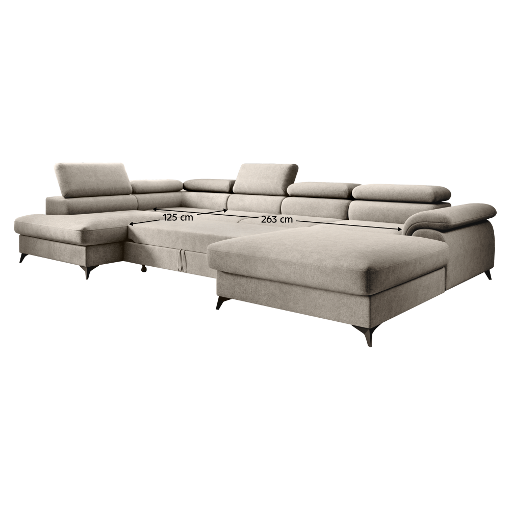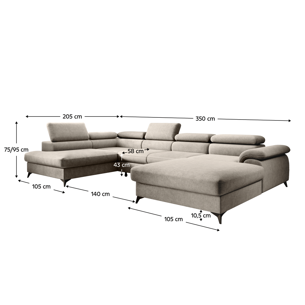 Material: ţesătură Whisper 02 Rezistenţa ţesăturii conform testului Martindale: 100.000 de cicluri de frecare Culoare: bej Dimensiuni (LxAxÎ): 350x205x75/95 cm Suprafaţa pentru dormit (LxL): 125x263 cm Înălţime scaun: 43 cm Adâncime scaun: 58 cm Distanţă între otomane: 140 cm Lăţime otoman: 105 cm Înălţime spătar: 52 cm Cu picioare Material picioare: metal Culoare picioare: neagră Înălţimea compartimentului inferior de la podea: 10,5 cm Umplutură: arcuri ondulate + spumă poliuretanică Extensibilă Tapiţată integral Variantă pentru partea stângă În formă de ?U? Cu spaţiu de depozitare 6 tetiere ajustabile 5 grade de înclinare a tetierelor Livrată dezasamblată Posibilitatea de a alege dintre 6 nuanţe ale ţesăturii Whisper la preţul de 9.799 Lei. Pentru comenzi personalizate este necesară plata unui avans de 10% din suma totală. După achitarea avansului, comanda dumneavoastră va intra în producţie. Termenul de livrare este de 6-8 săptămâni.