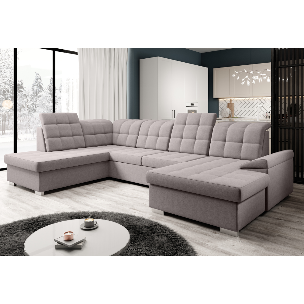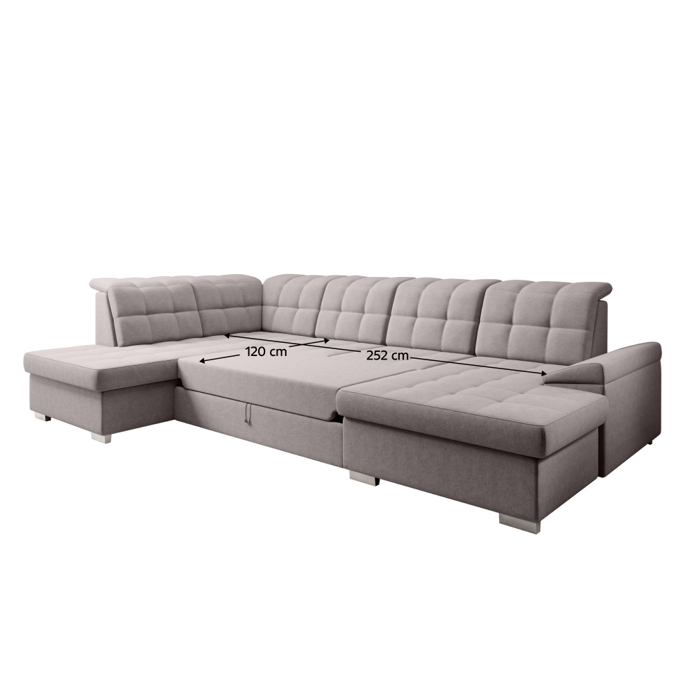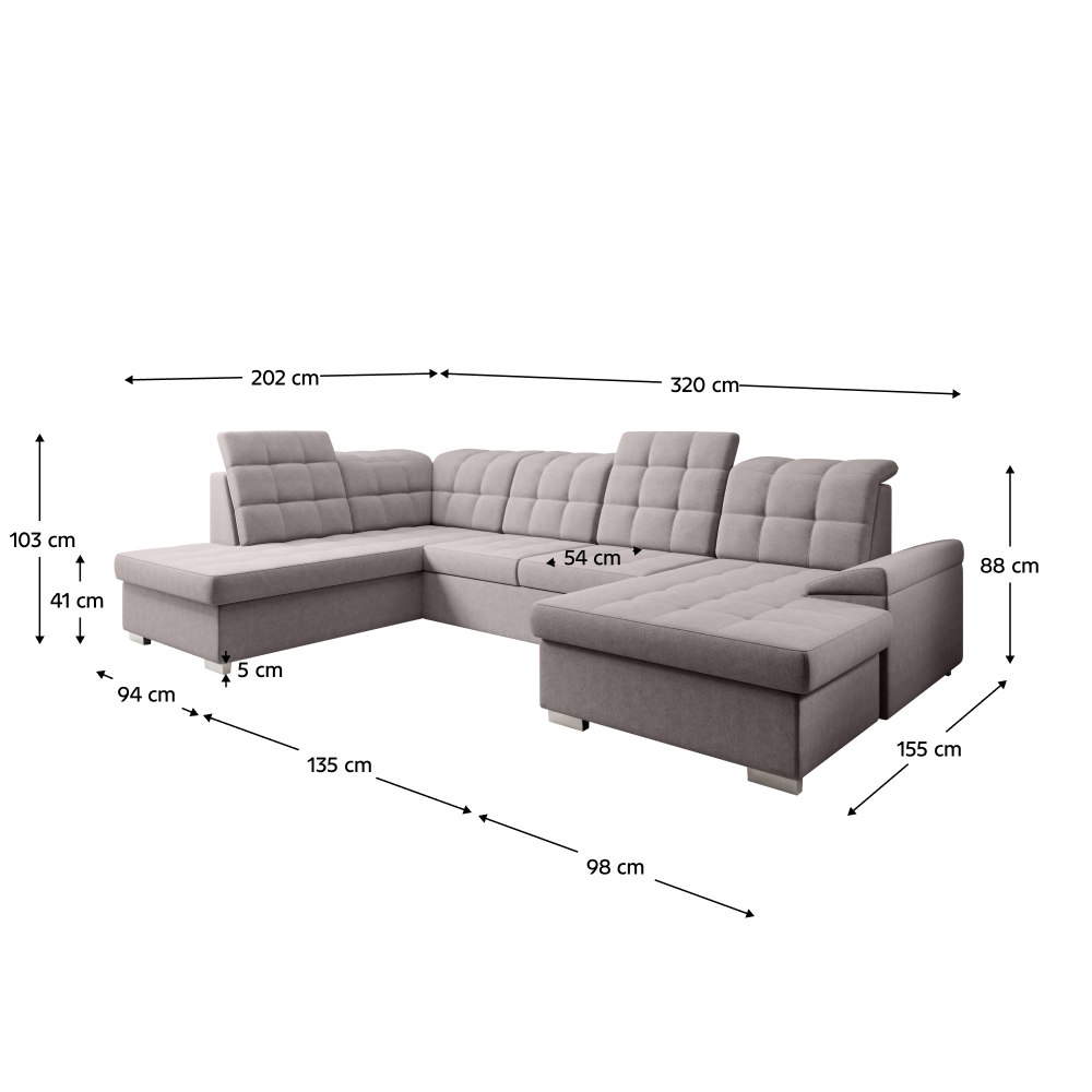 Material tapiţerie: ţesătură Soro 23 Rezistenţa la frecare a ţesăturii conform testului Martindale: 90.000 Culoare tapiţerie: gri-bej Taupe Dimensiuni (LxAxÎ): 320x202/155x88/103 cm Suprafaţa pentru dormit (LxL): 120x252 cm Înălţime scaun: 41 cm Adâncime scaun: 54 cm Lăţime otoman: 98 cm Lăţime scaun: 135 cm Cu picioare Materialul picioarelor: plastic Culoarea picioarelor: argintiu Înălţimea compartimentului inferior de la podea: 5 cm Capacitate de susţinere per persoană: 90 kg Umplutura: arcuri ondulate + spumă poliuretanică, Colţar extensibil tapiţat integral, în formă de U, cu două spaţii de depozitare, Tetiere ajustabile, Variantă pentru partea stângă, Livrat dezasamblat,