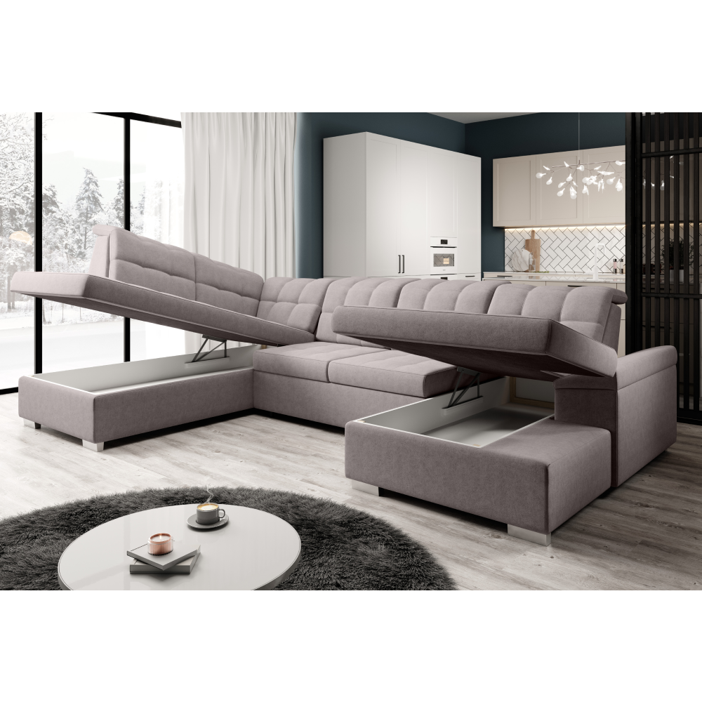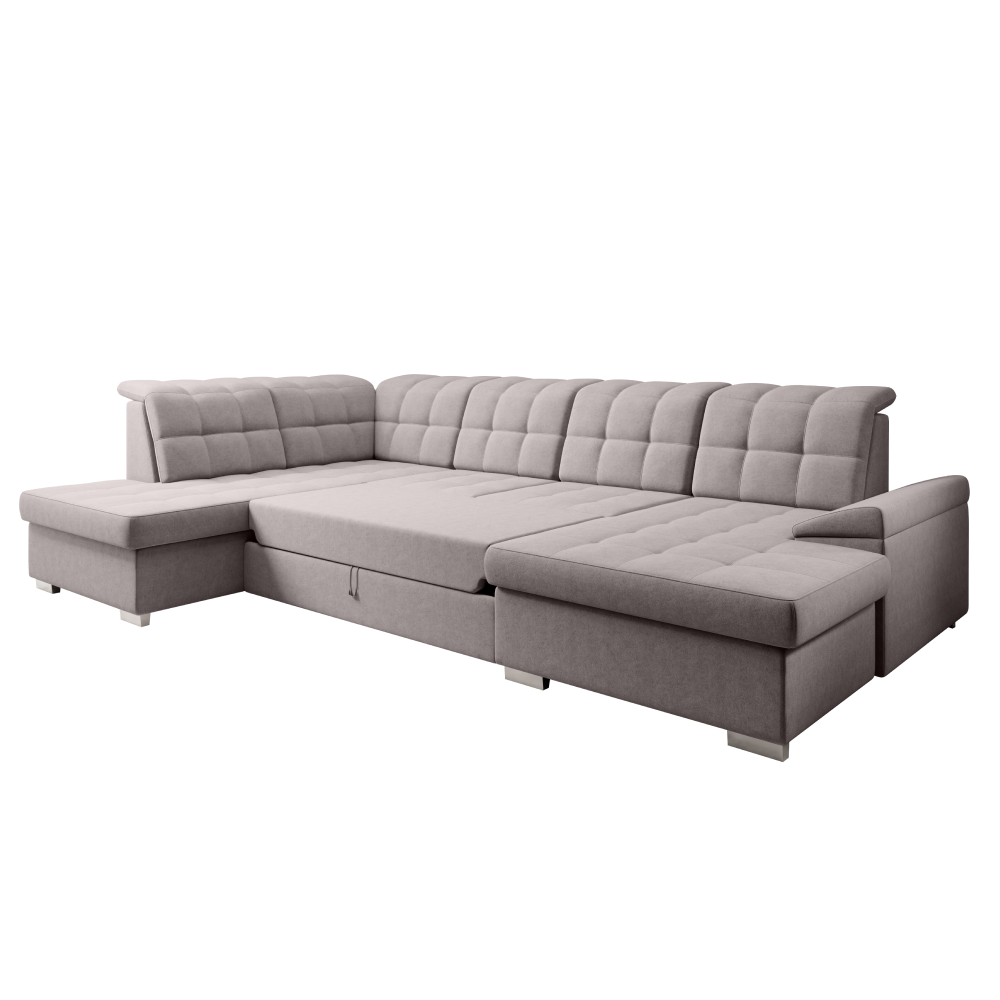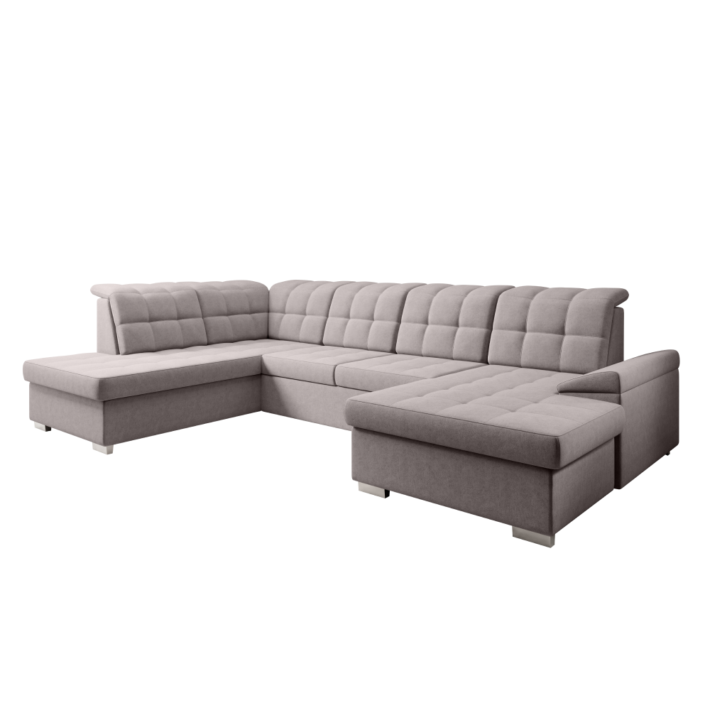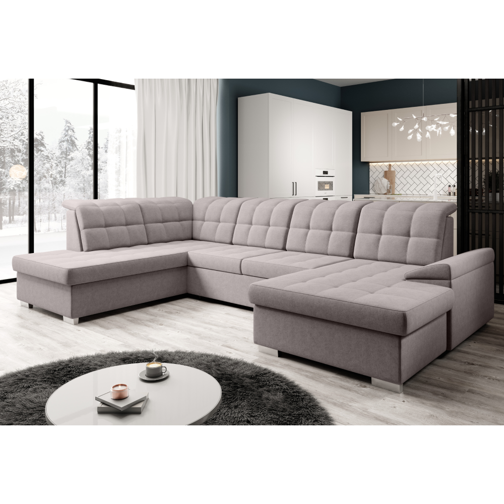 Material tapiţerie: ţesătură Soro 23 Rezistenţa la frecare a ţesăturii conform testului Martindale: 90.000 Culoare tapiţerie: gri-bej Taupe Dimensiuni (LxAxÎ): 320x202/155x88/103 cm Suprafaţa pentru dormit (LxL): 120x252 cm Înălţime scaun: 41 cm Adâncime scaun: 54 cm Lăţime otoman: 98 cm Lăţime scaun: 135 cm Cu picioare Materialul picioarelor: plastic Culoarea picioarelor: argintiu Înălţimea compartimentului inferior de la podea: 5 cm Capacitate de susţinere per persoană: 90 kg Umplutura: arcuri ondulate + spumă poliuretanică, Colţar extensibil tapiţat integral, în formă de U, cu două spaţii de depozitare, Tetiere ajustabile, Variantă pentru partea stângă, Livrat dezasamblat,