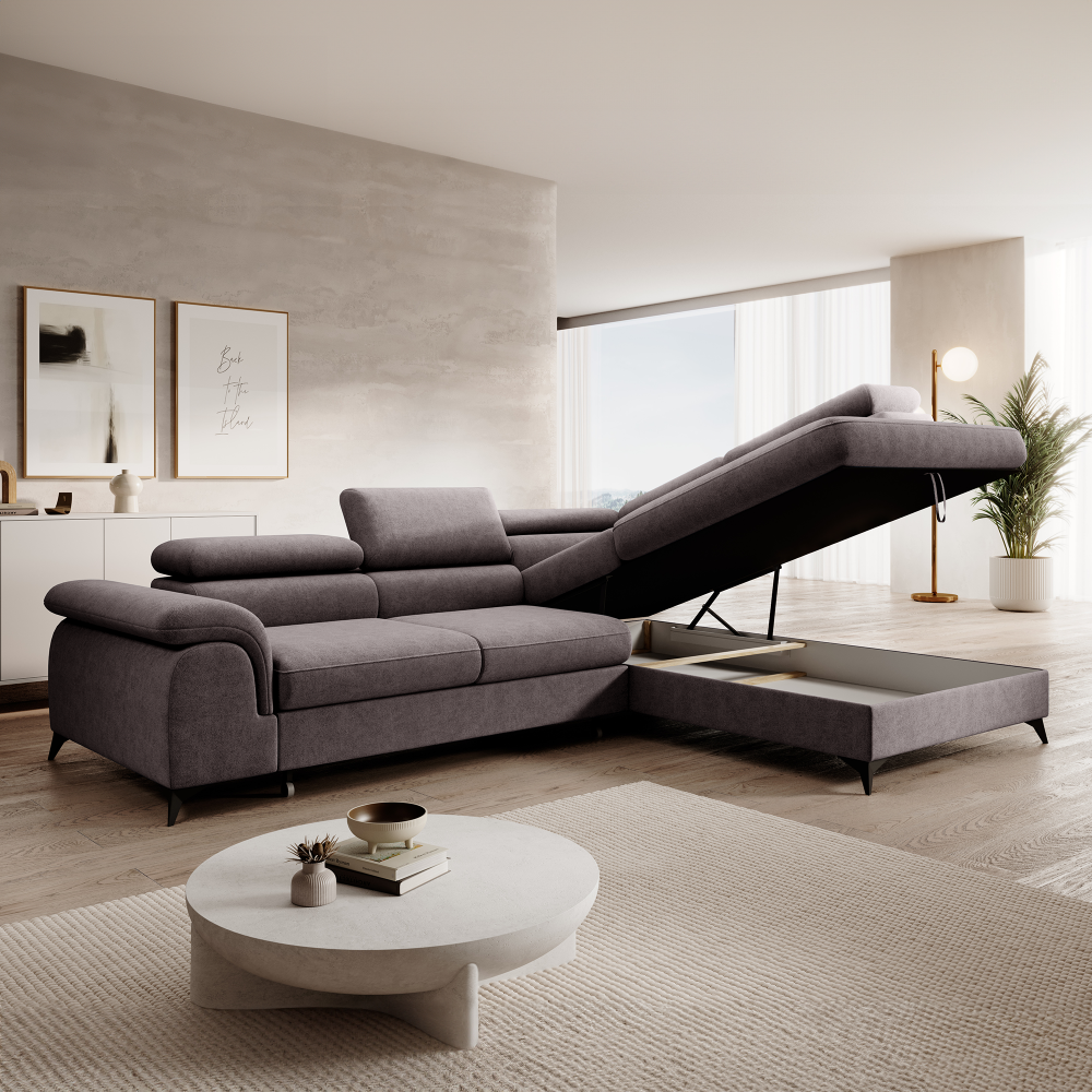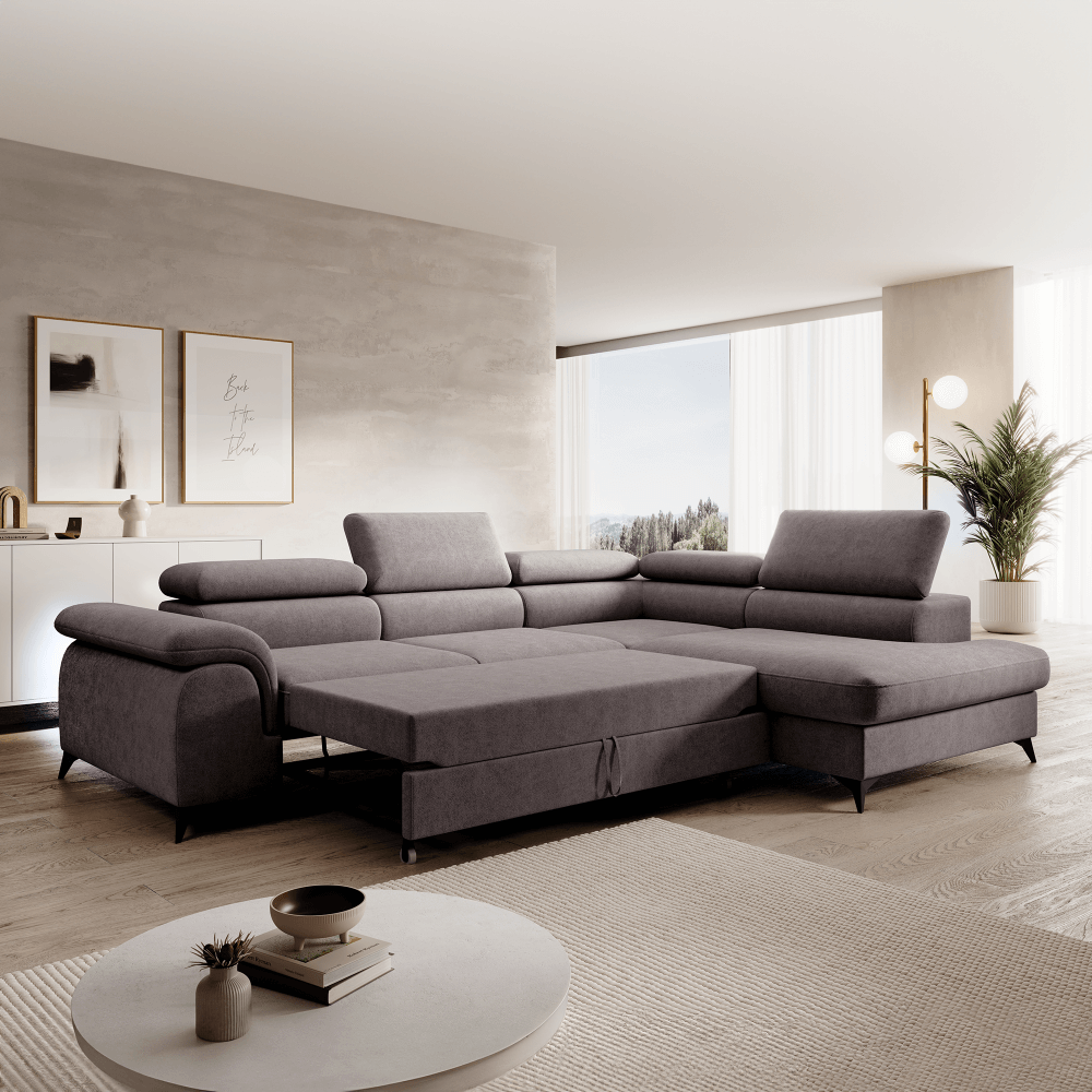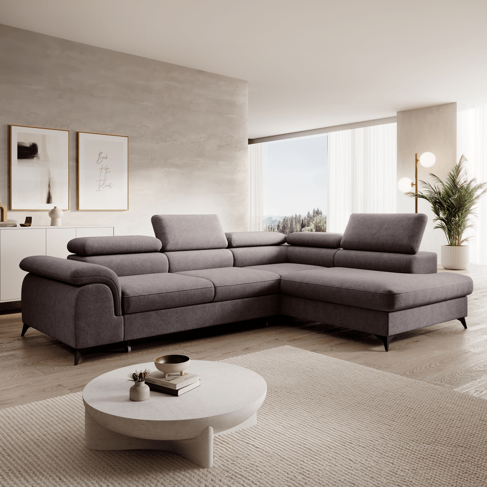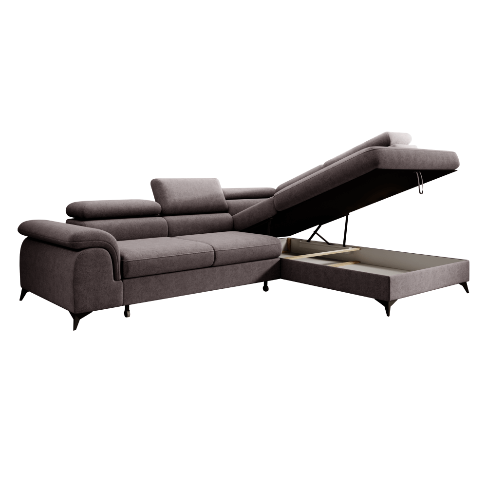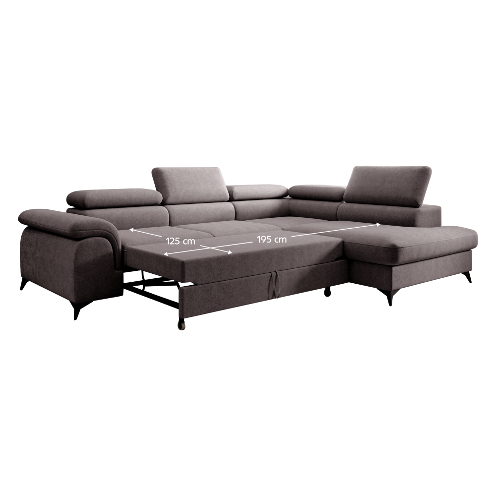 Material: ţesătură Whisper 05 Rezistenţa ţesăturii conform testului Martindale: 100.000 de cicluri de frecare Culoare: maro Dimensiuni (LxAxÎ): 275x205x75/95 cm Suprafaţa pentru dormit (LxL): 125x195 cm Înălţime scaun: 43 cm Adâncime scaun: 58 cm Dimensiunea scaunului: 140 cm Lăţime otoman: 105 cm Cu picioare Material picioare: metal Culoare picioare: neagră Înălţimea compartimentului inferior de la podea: 10,5 cm Umplutură: arcuri ondulate + spumă poliuretanică Extensibilă Tapiţată integral Variantă pentru partea dreaptă În formă de ?L? Cu spaţiu de depozitare 5 tetiere ajustabile 5 grade de înclinare a tetierelor Livrată dezasamblată Posibilitatea de a alege dintre 6 nuanţe ale ţesăturii Whisper la preţul de 1 269 Eur. Pentru comenzi personalizate este necesară plata unui avans de 10% din suma totală. După achitarea avansului, comanda dumneavoastră va intra în producţie. Termenul de livrare este de 6-8 săptămâni.