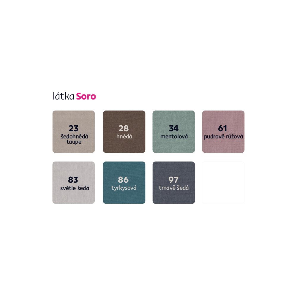 Este posibil să comandaţi în 7 culori de stofă Soro la un preţul de 6 999,-. cu un termen de livrare de 6-8 săptămâni. Pentru comenzi individuale, este necesar un depozit de 10% din suma dată. După plata avansului, cererea dumneavoastră va fi introdusă în producţie.