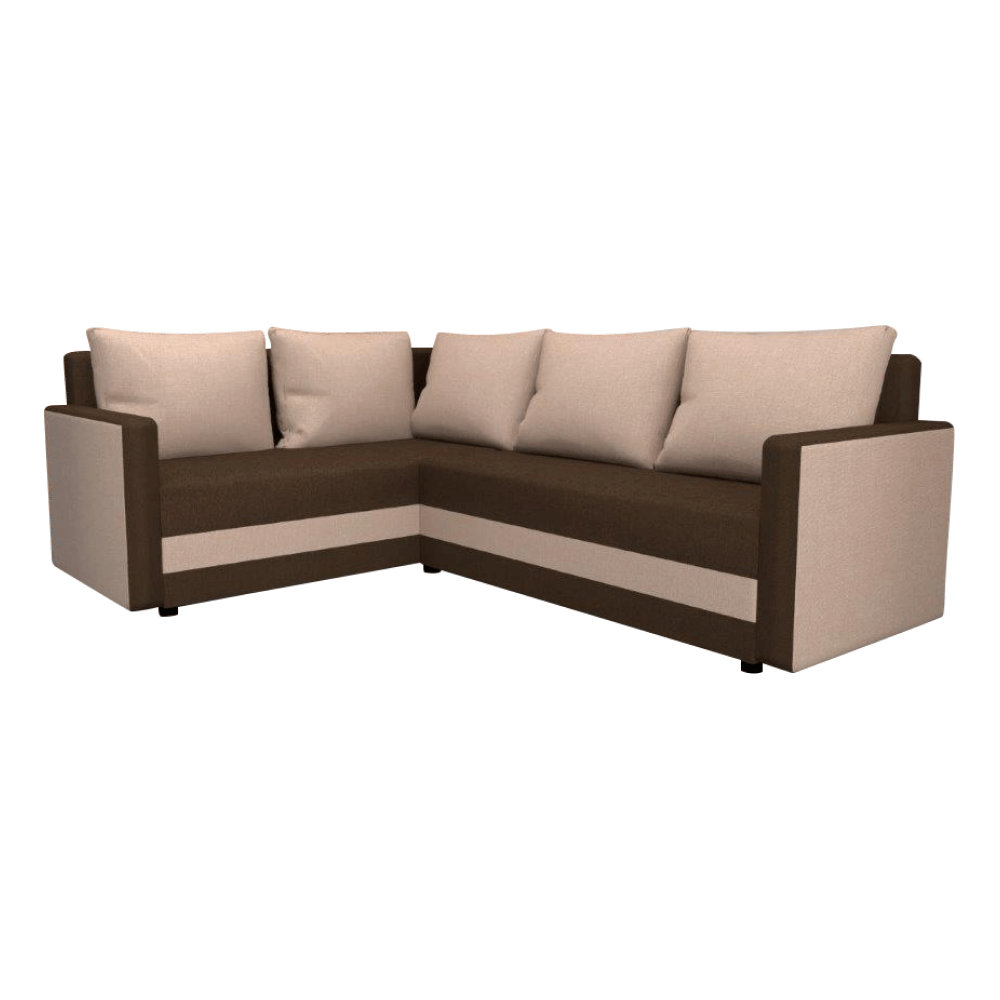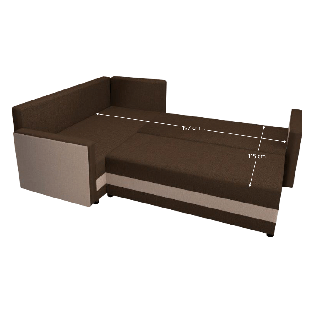 Material tapiţerie: ţesătură Savana 17/16 Rezistenţa ţesăturii conform testului Martindale: 80.000 de cicluri de frecare Culoare tapiţerie: bej / maro Dimensiuni (LxAxÎ): 214x144/71x73 cm Suprafaţa pentru dormit (LxL): 115x197 cm Dimensiuni cotieră (LxA): 10x75 cm Înălţimea scaunului: 39 cm Adâncime scaun: 45/65 cm Cu picioare din plastic Culoare picioare: neagră Înălţimea spaţiului inferior de la podea: 2,5 cm Umplutură: spumă poliuretanică Extensibilă Colţar Universală (stânga / dreapta) Cu spaţiu de depozitare Furnizată cu cinci perne Dimensiuni pernă (LxL): 64x46 cm Livrată dezasamblată