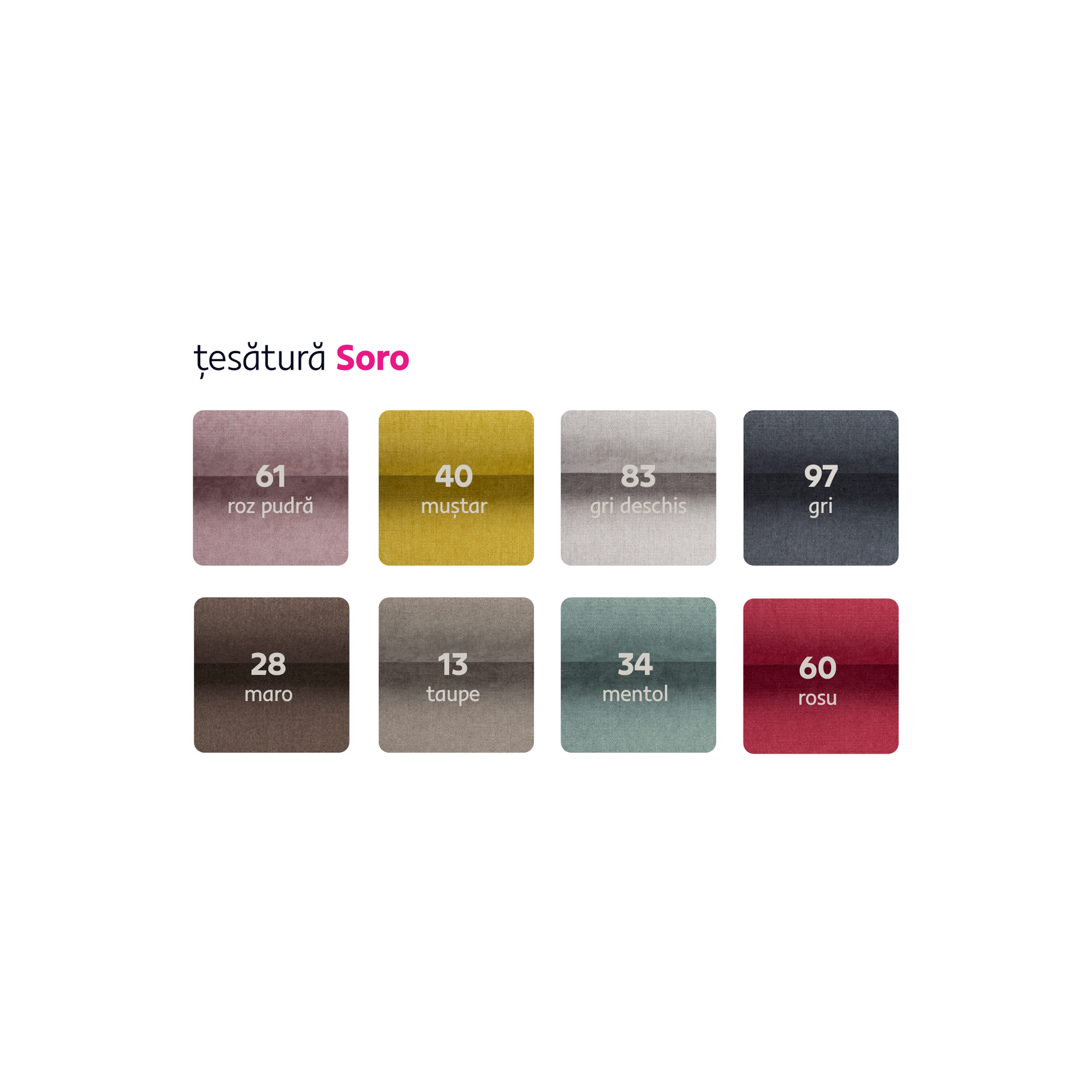 Posibilitatea de a comanda şi în alte modele de culori. Disponibilă în 8 modele a materialului textil Soro. Pentru o comandă individuală, este necesar să plătiţi un avans de 10% din sumă. După achitarea avansului, comanda dvs. va fi dată în producţie. Durata de livrare este între 14-18 săptămâni.
