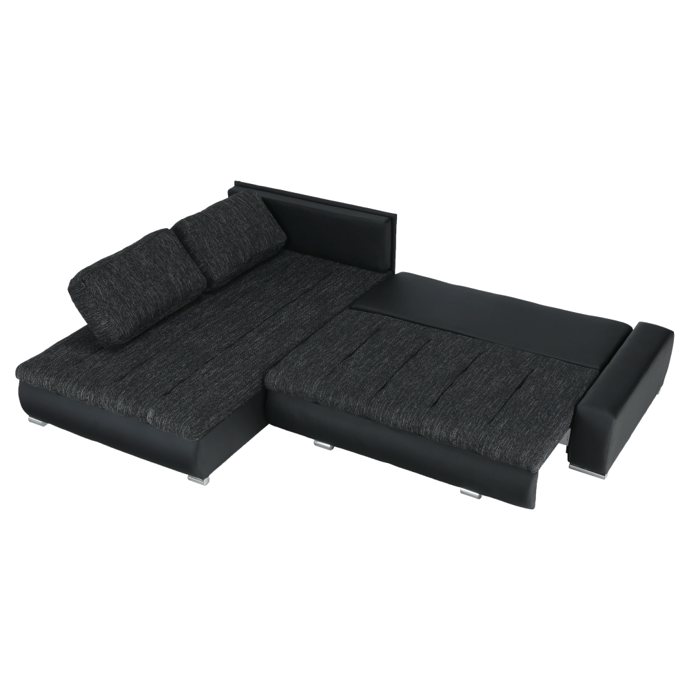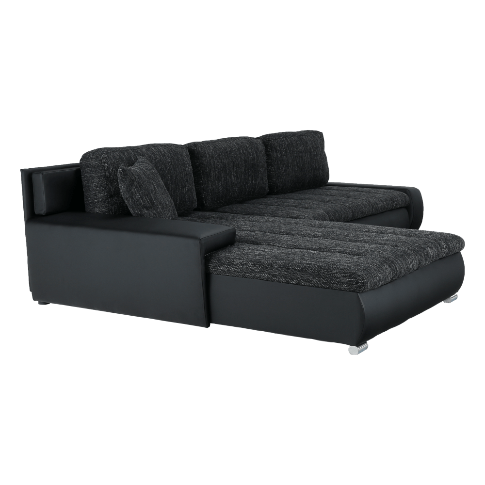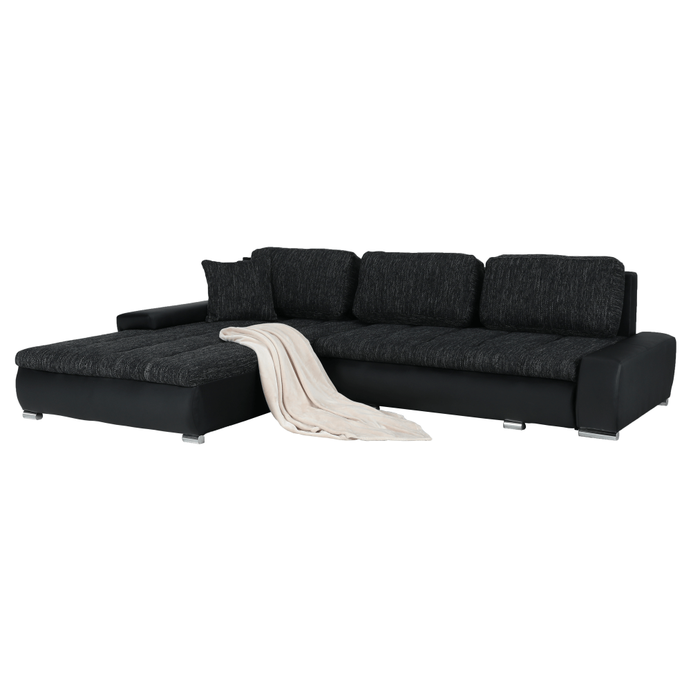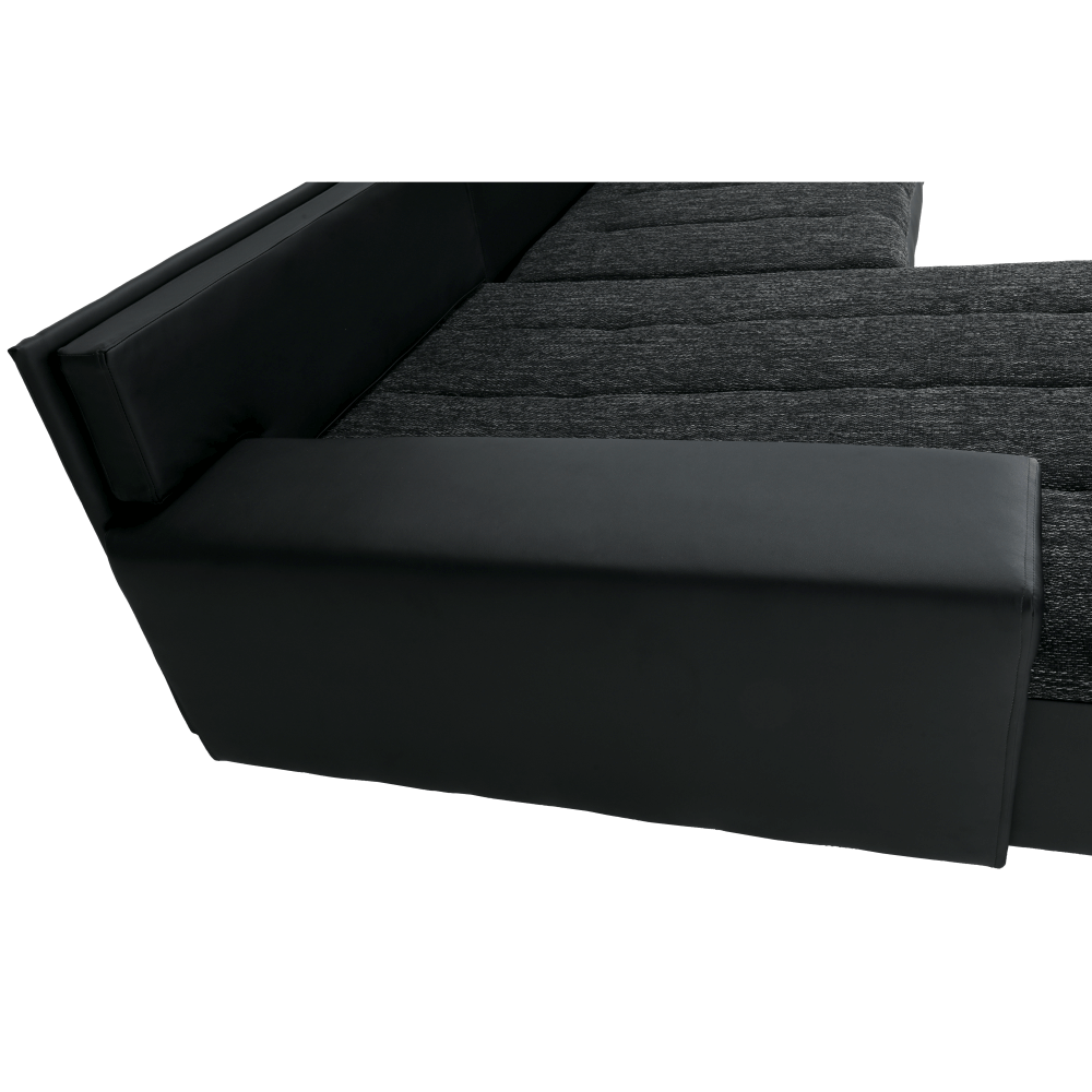 Colţar extensibil, tapiţat, universal (S/D) cu spaţiu pt. depozitare, material: piele eco 1100 negru/material Nevada 10 negru şuviţat. Dimensiuni (LxGxÎ): 300x215x73 cm, Spaţiu pt. dormit (LxGŞ) 150x240 cm, Înălţimea şi adâncimea şezutului: 42x65/85 cm.