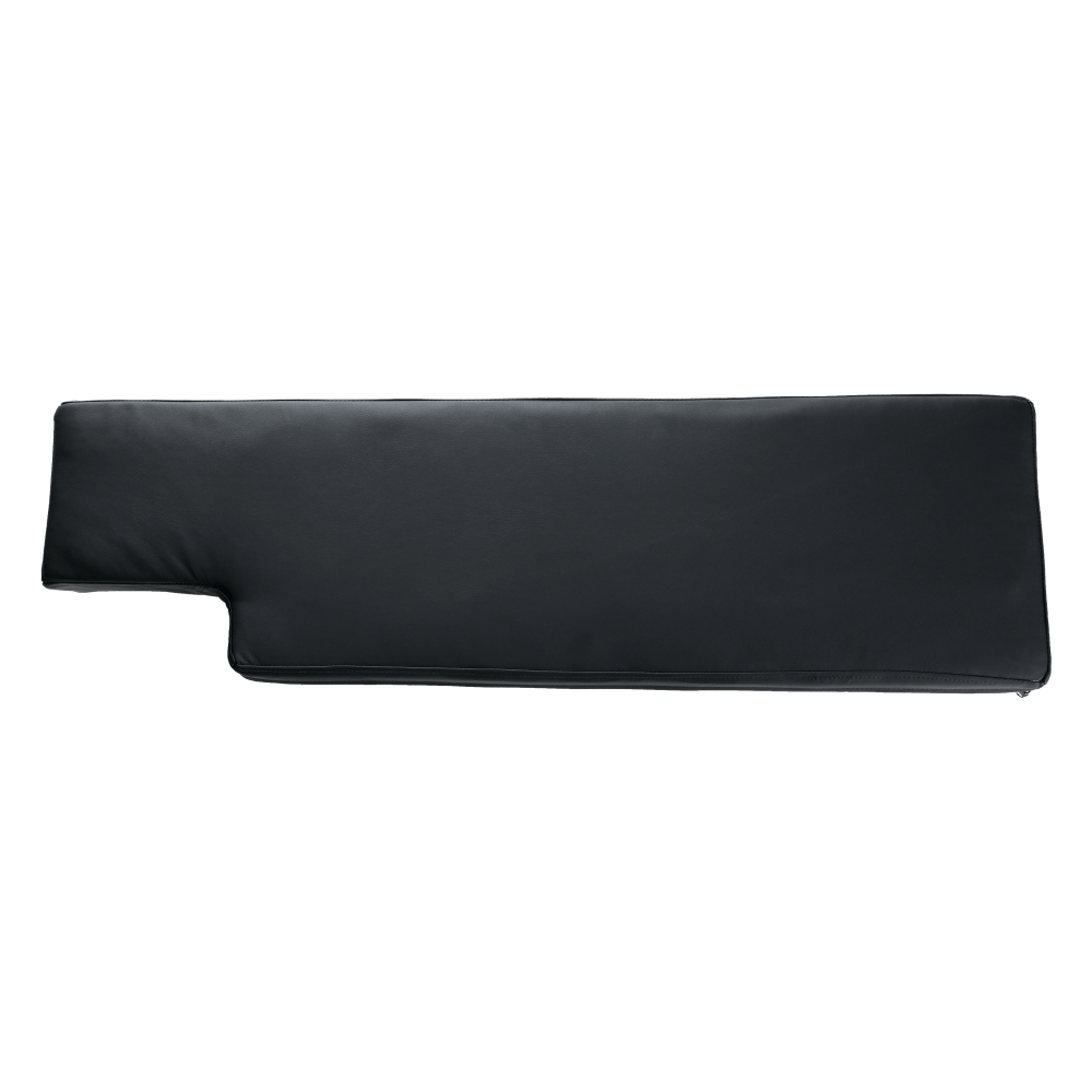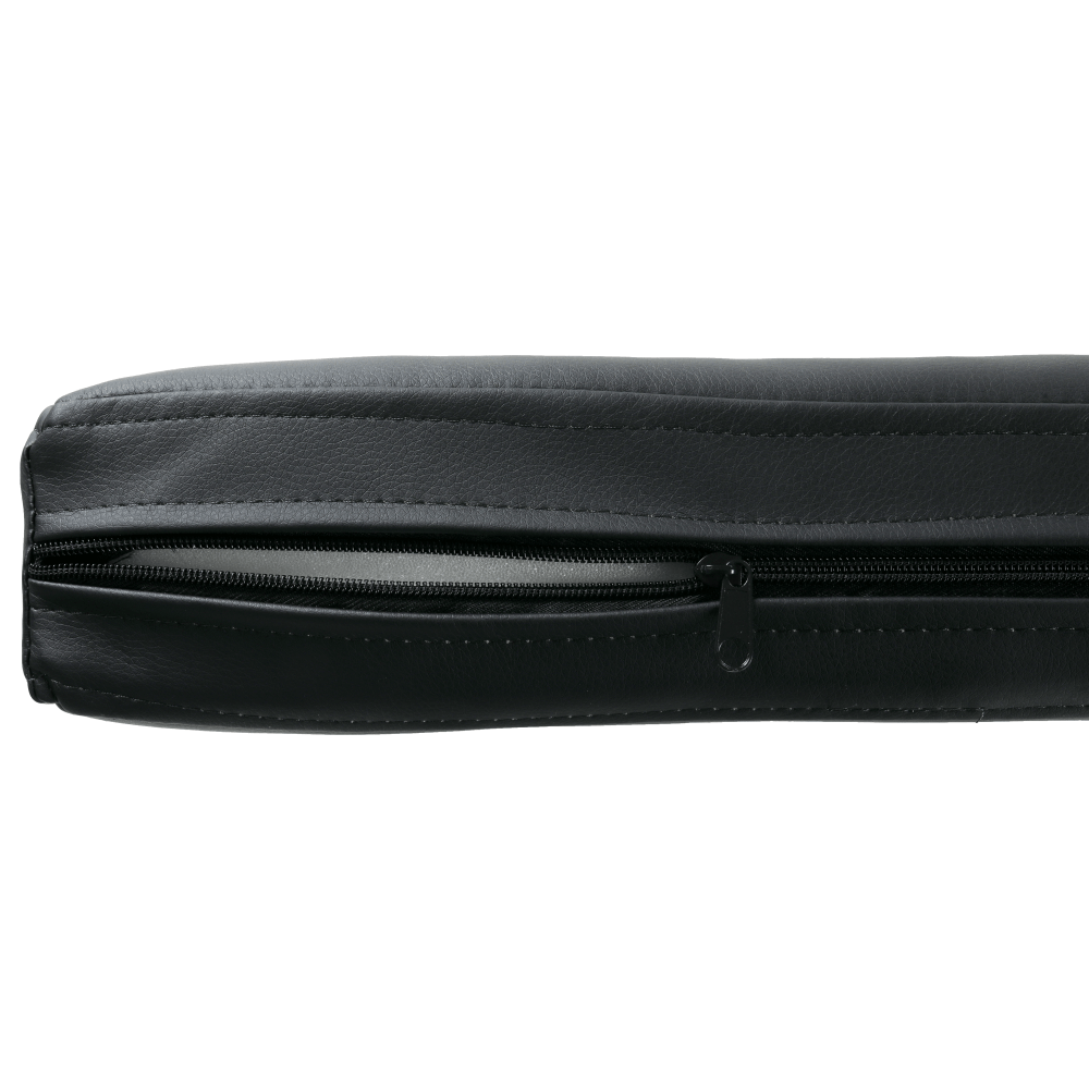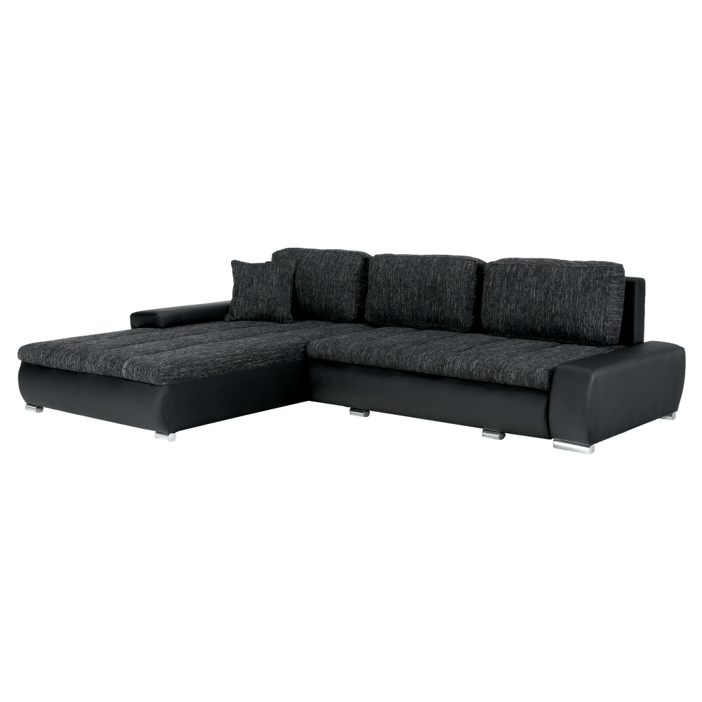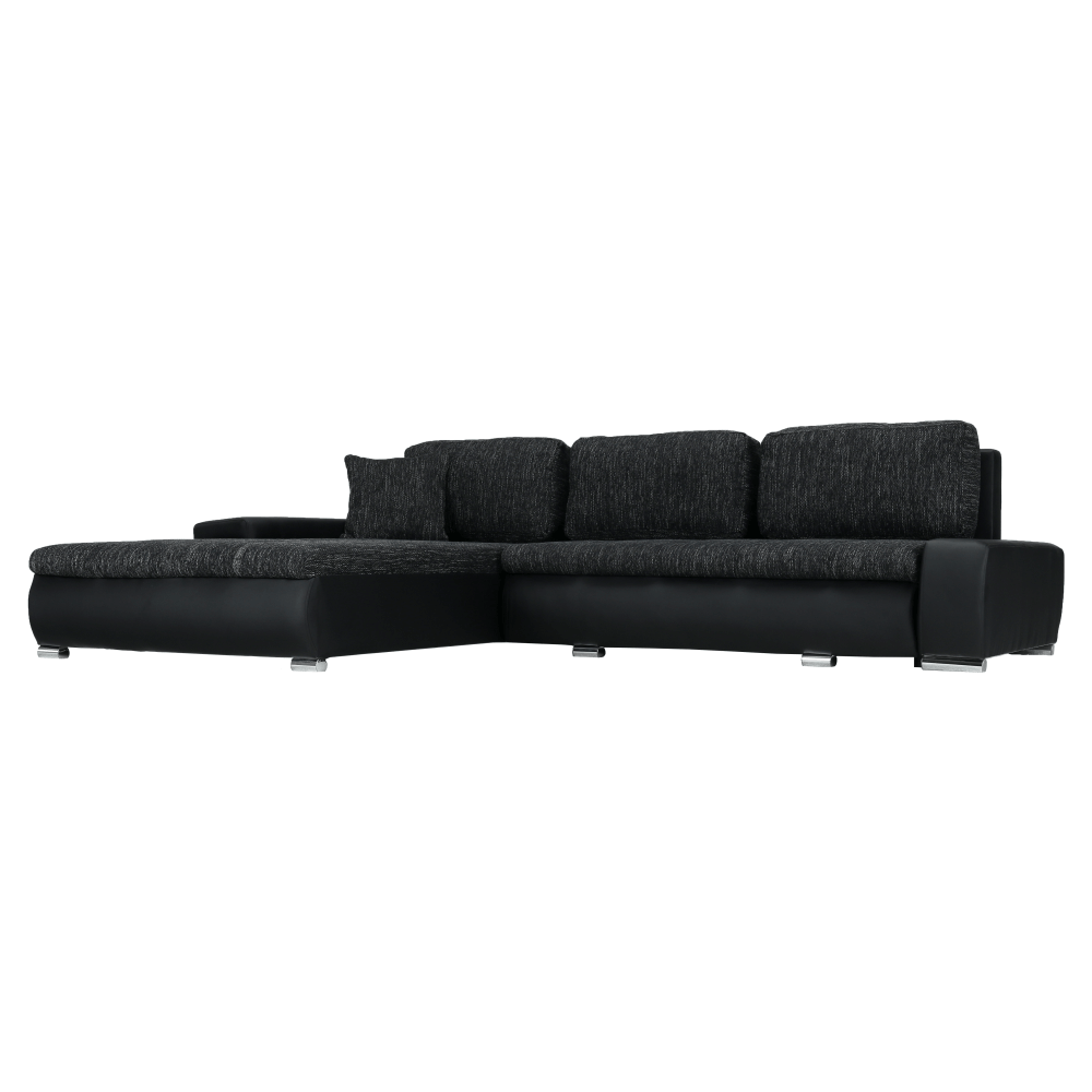 Colţar extensibil, tapiţat, universal (S/D) cu spaţiu pt. depozitare, material: piele eco 1100 negru/material Nevada 10 negru şuviţat. Dimensiuni (LxGxÎ): 300x215x73 cm, Spaţiu pt. dormit (LxGŞ) 150x240 cm, Înălţimea şi adâncimea şezutului: 42x65/85 cm.