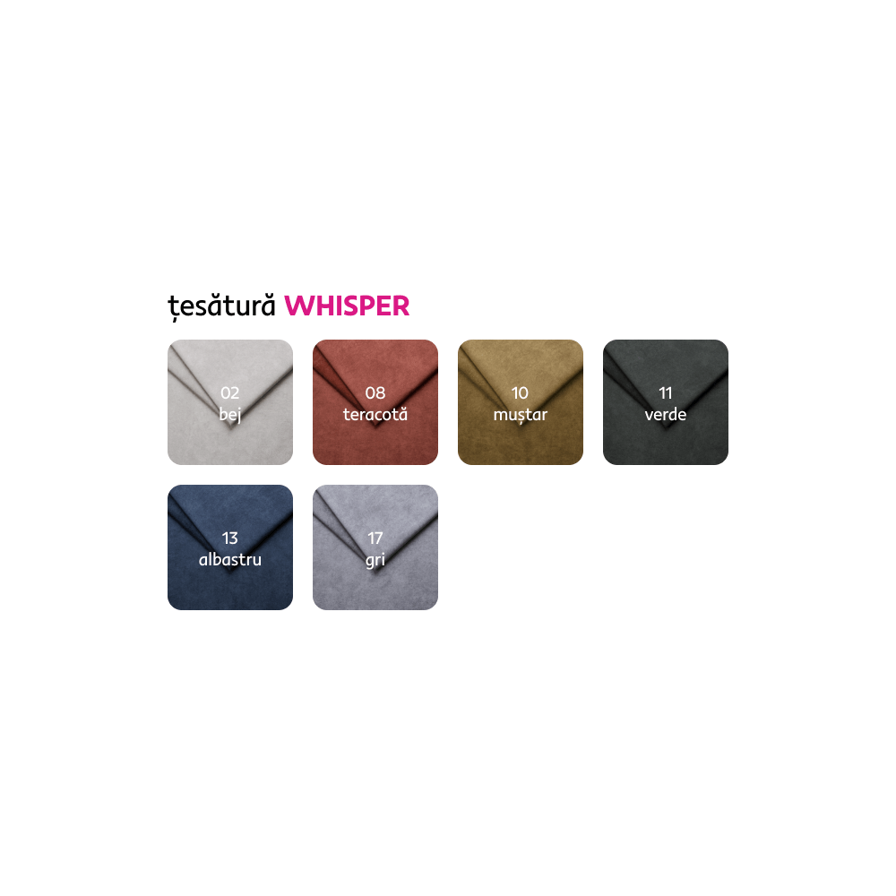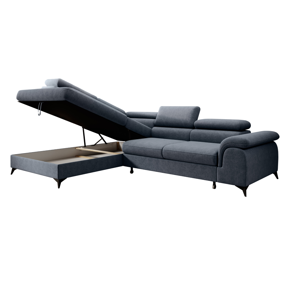 Material: ţesătură Whisper 15 Rezistenţa ţesăturii conform testului Martindale: 100.000 de cicluri de frecare Culoare: gri Dimensiuni (LxAxÎ): 275x205x75/95 cm Suprafaţa pentru dormit (LxL): 125x195 cm Înălţime scaun: 43 cm Adâncime scaun: 58 cm Dimensiunea scaunului: 140 cm Lăţime otoman: 105 cm Cu picioare Material picioare: metal Culoare picioare: neagră Înălţimea compartimentului inferior de la podea: 10,5 cm Umplutură: arcuri ondulate + spumă poliuretanică Extensibilă Tapiţată integral Variantă pentru partea stângă În formă de ?L? Cu spaţiu de depozitare 5 tetiere ajustabile 5 grade de înclinare a tetierelor Livrată dezasamblată Posibilitatea de a alege dintre 6 nuanţe ale ţesăturii Whisper la preţul de 1 269 Eur. Pentru comenzi personalizate este necesară plata unui avans de 10% din suma totală. După achitarea avansului, comanda dumneavoastră va intra în producţie. Termenul de livrare este de 6-8 săptămâni.