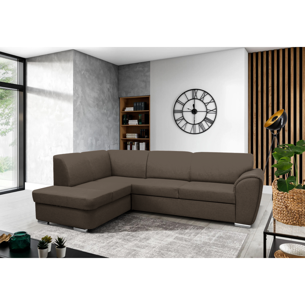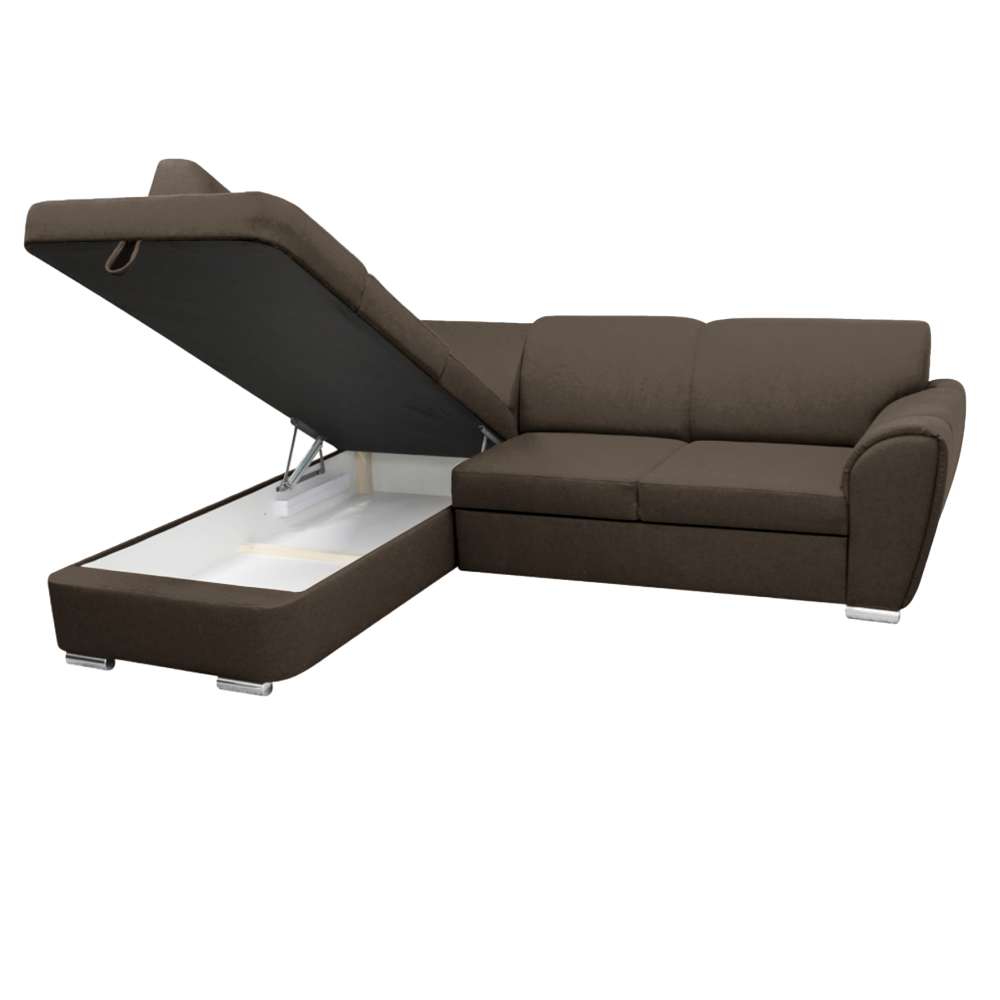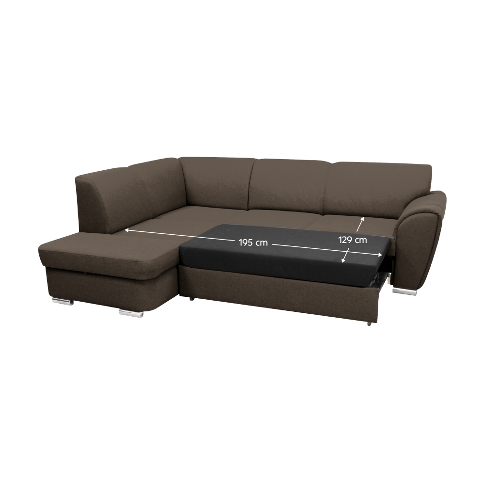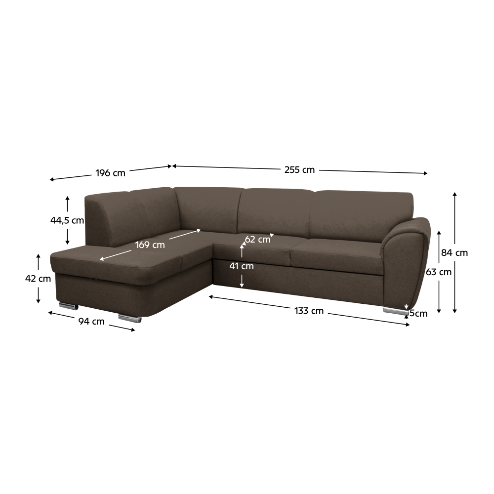 Material: ţesătură Melva 20 Rezistenţa ţesăturii conform testului Martindale: 80 000 de cicluri de frecare Culoare: maro Dimensiuni (LxAxÎ): 255x196x84 cm Suprafaţa pentru dormit (LxL): 129x195 cm Înălţime scaun: 41 cm Adâncime scaun: 62 cm Înălţime spătar: 44,5 cm Lăţime scaun: 133 cm Dimensiuni otoman (LxL): 94x169 cm Înălţimea compartimentului inferior de la podea: 5 cm Înălţimea cotierei: 63 cm Umplutură: arcuri ondulate/spumă poliuretanică Picioare din plastic Culoare picioare: argintie Tapiţată integral Colţar extensibil Variantă pentru partea stângă Spaţiu de depozitare Livrată dezasamblată