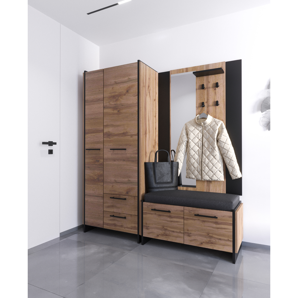 Material: DTD laminat/margini ABS Material tapiţerie: ţesătură Orinoco 96 Rezistenţă la frecare conform testului Martindale: 45 000 - 50 000 cicluri de frecare Culoare: stejar wotan/negru Dimensiuni (Lxlxh): 96x45x45 cm Grosime material: 1,6 cm Mânere metalice Culoare mânere negru Portanţă pantofar: 40 kg Spaţiu de depozitare Cu două uşi Portanţă placă inferioară: 5 kg Livrat cu o pernă Dimensiunile pernei (Lxlxh): 90x42x5 cm DTD dublu laminat Picioare din plastic Design modern Vă recomandăm să-l fixaţi de perete Livrat dezasamblat
