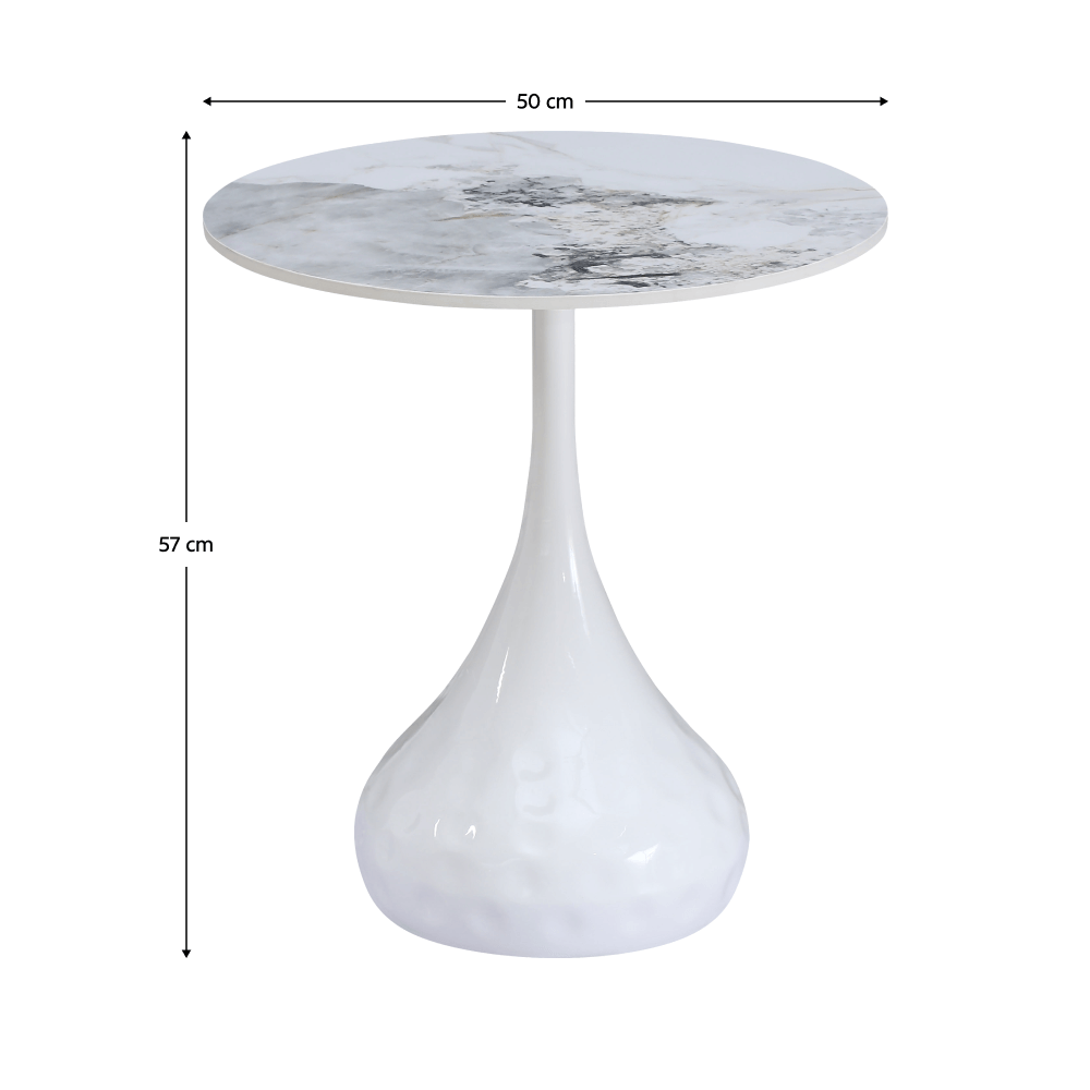 Material: piatră şlefuită/oţel Culoare: marmură albă/albă Dimensiuni masă (Lxh): 50x57 cm Piesă originală Rotundă Modernă şi elegantă Grosimea blatului de masă: 1,1 cm Portanţă: 15 kg Livrat dezasamblat