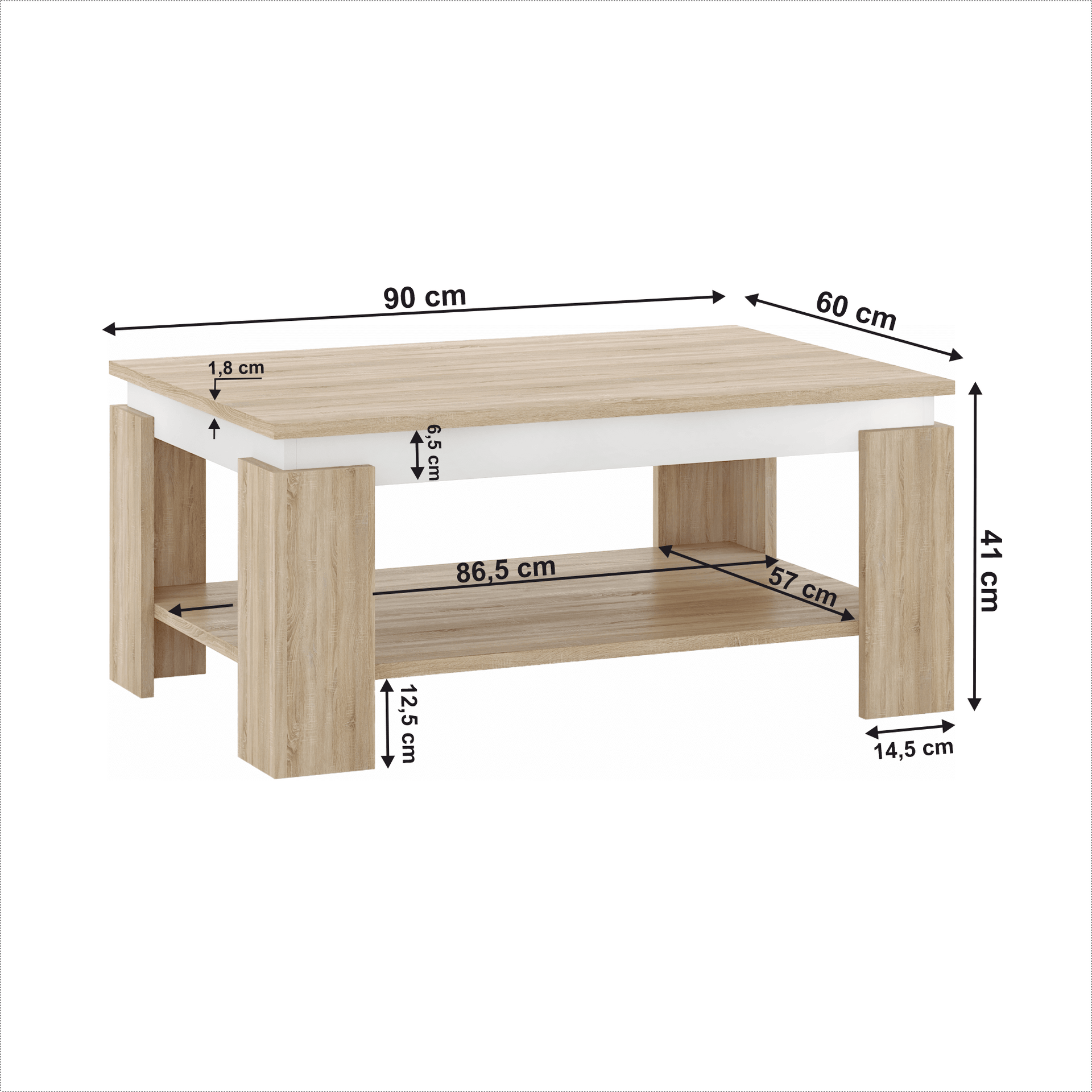 Material: HDF laminat / muchii din ABS Culori: stejar sonoma / albă Dimensiuni (LxAxÎ): 90x60x41 cm Cu spaţiu de depozitare Dimensiunile compartimentului de depozitare (LxA): 86,5x57 cm Grosimea plăcii superioare: 1,8 cm Grosime cadru: 1,6 cm Capacitate de încărcare: 15 kg Înălţimea compartimentului inferior de la podea: 12,5 cm Livrată dezasamblată