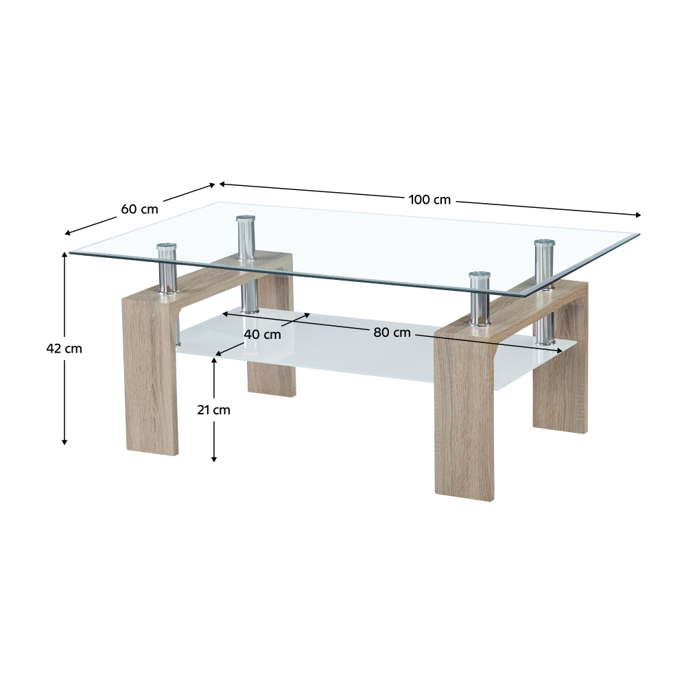 Măsuţă de cafea LIBOR 2 NEW Material: MDF înfoliat/sticlă securizată Varianta: stejar sonoma/sticlă transparentă/sticlă mată, dimensiuni (Lxlxh): 100x60x42 cm Dimensiuni rafturi (LxA): 80x40 cm Grosimea materialului MDF: 2 cm Grosimea sticlei superioare: 6 mm Grosimea sticlei inferioare: 5 mm Livrată dezasamblată