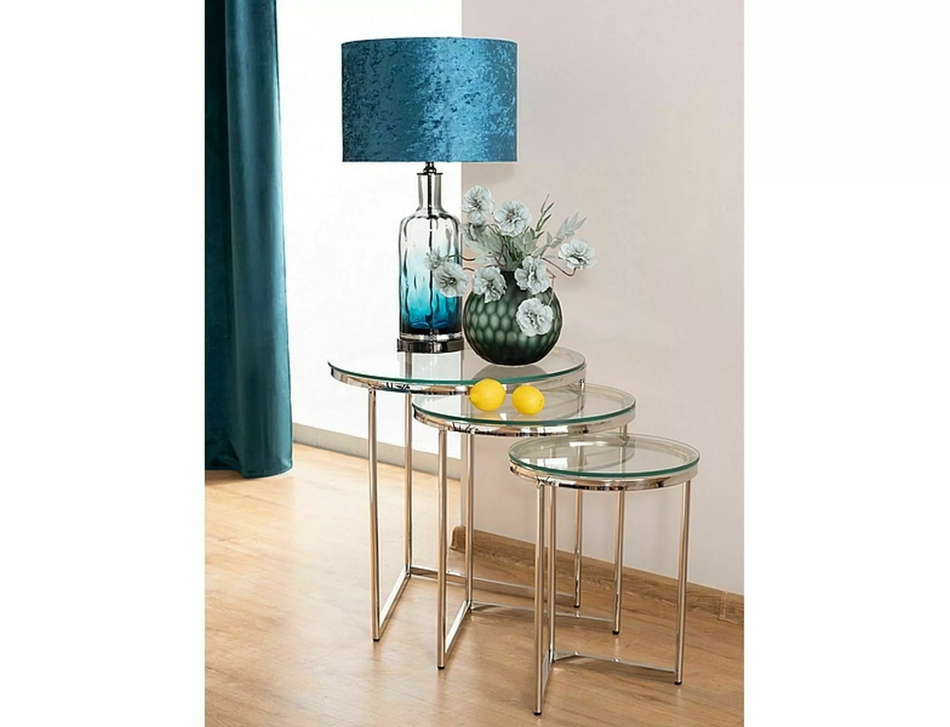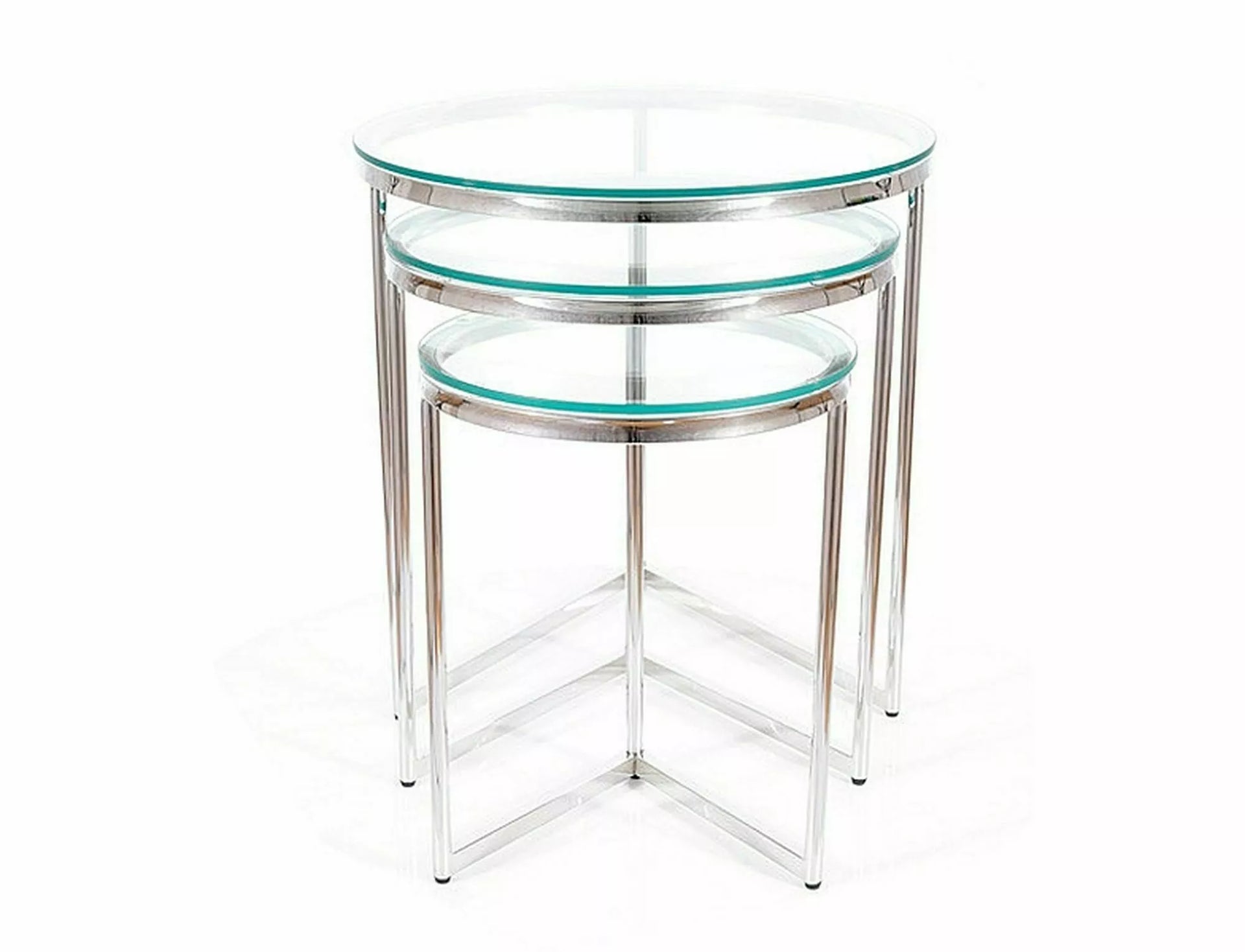 Set trei bănci, blat: sticlă călită transparentă, cadru: oțel inoxidabil, culoare: argintiu. Dimensiunile meselor mai mici: fi-35xh-46, fi-45xh-51 cm.