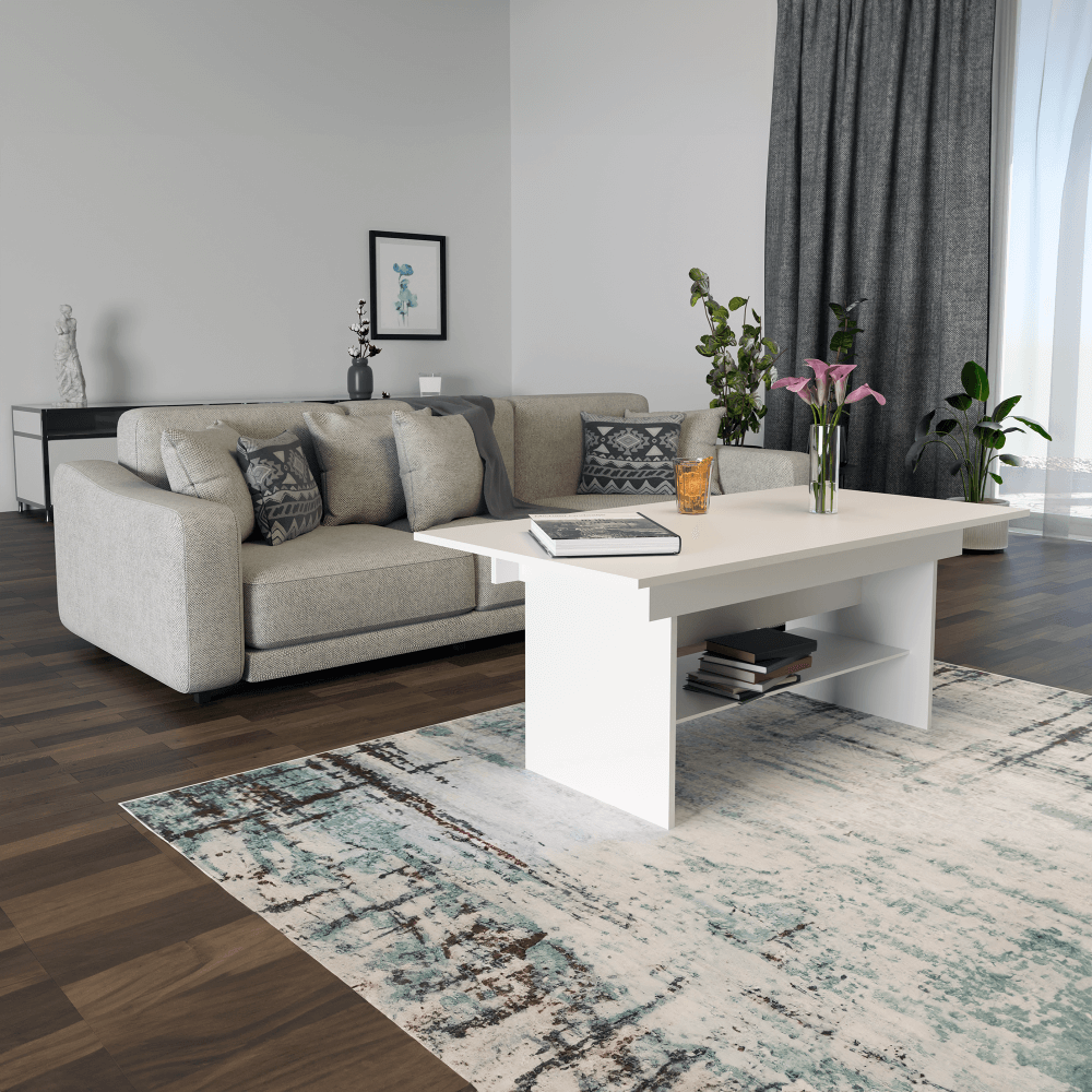 Material: DTD lamina Culoare: albă Dimensiuni (Lxlxh): 120-160x70x60,5-72 cm Grosimea DTD laminată: 1,6 cm Grosimea marginii ABS: 0,5 mm Sala de conferinţe/de mese Extensibil Reglabil în înălţime Are mecanism de ridicare Cu poliţă Dimensiunea poliţei: 88x30 cm Potrivit pentru 4-6 persoane Portanţa plăcii superioare: 20 kg Modernă Livrată dezasamblată