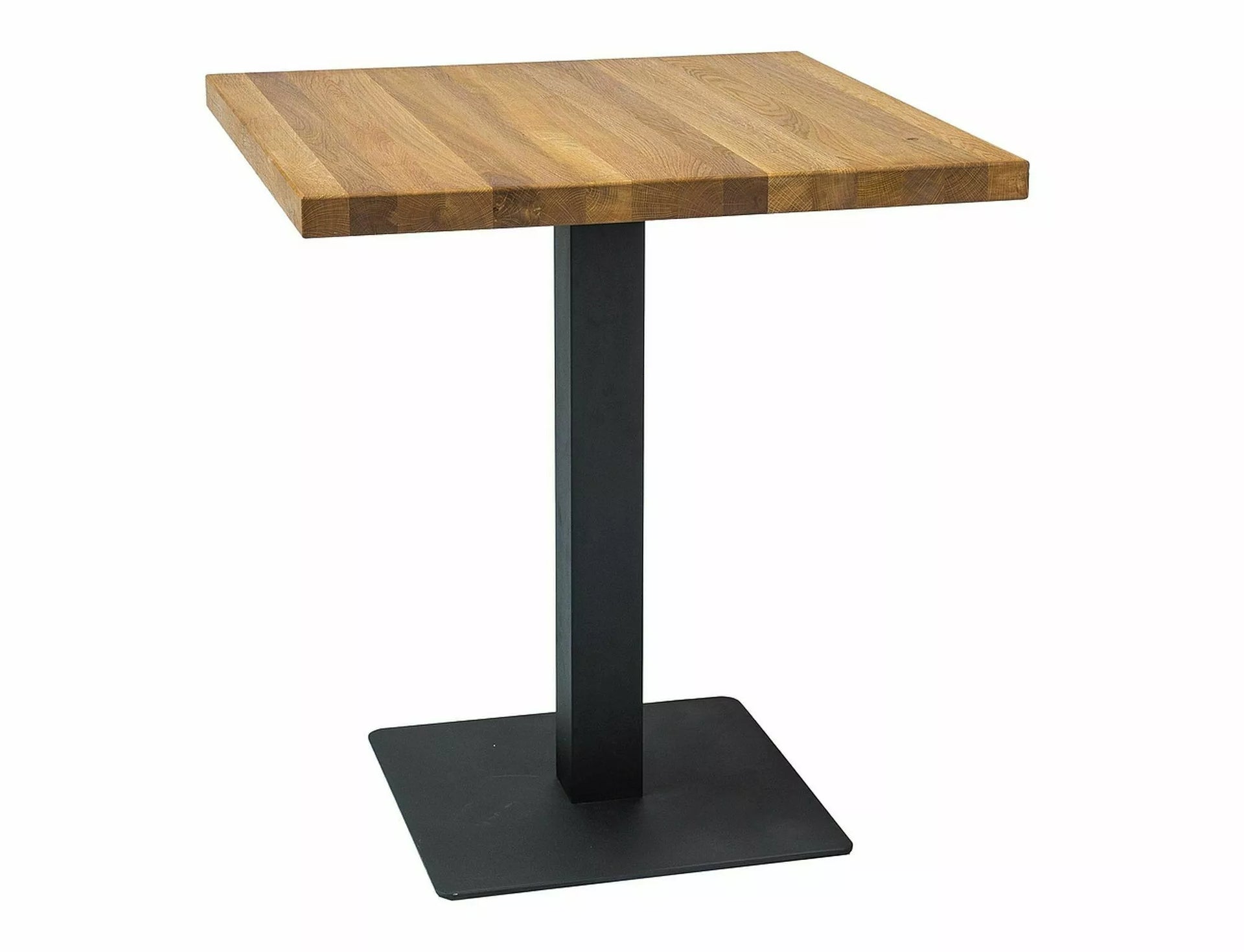 Masa, blat: lemn masiv de stejar, cadru: metal, culoare: stejar natural / negru. Dimensiuni baza 45x45cm, profil picior 8x8cm. Blatul mesei este din stejar laminat, culoarea si granulatia rezulta din structura lemnului folosit.