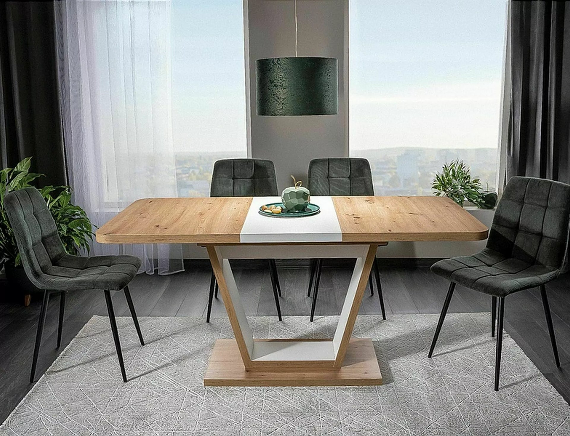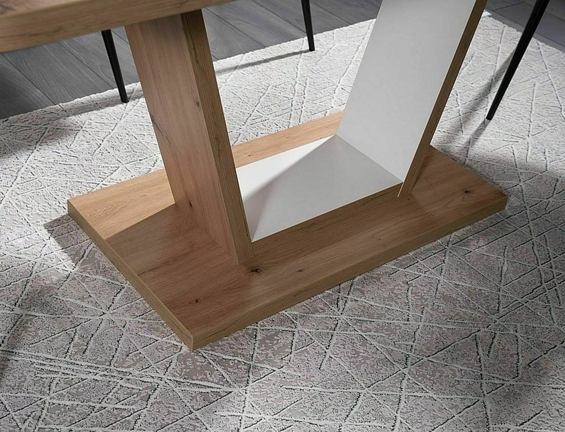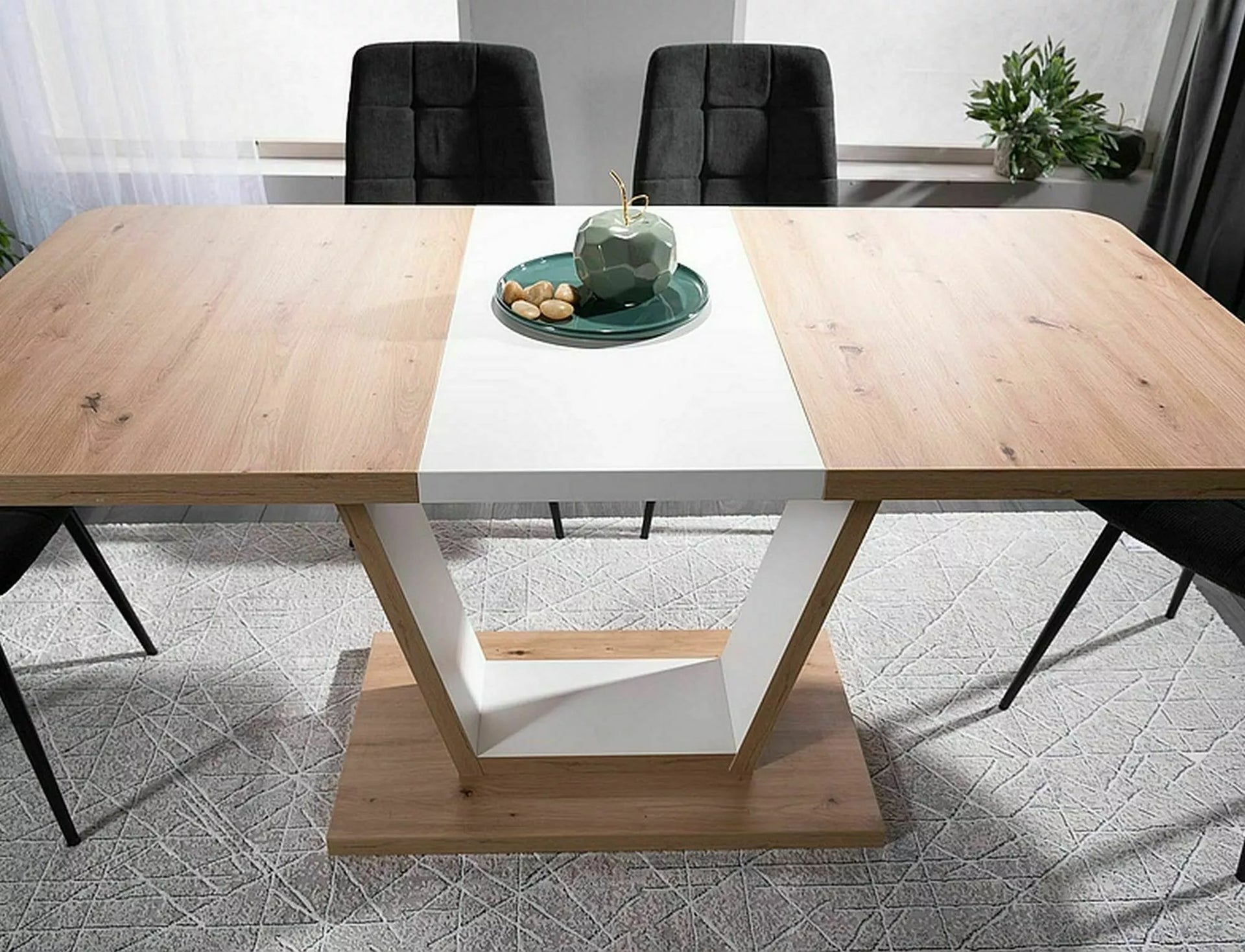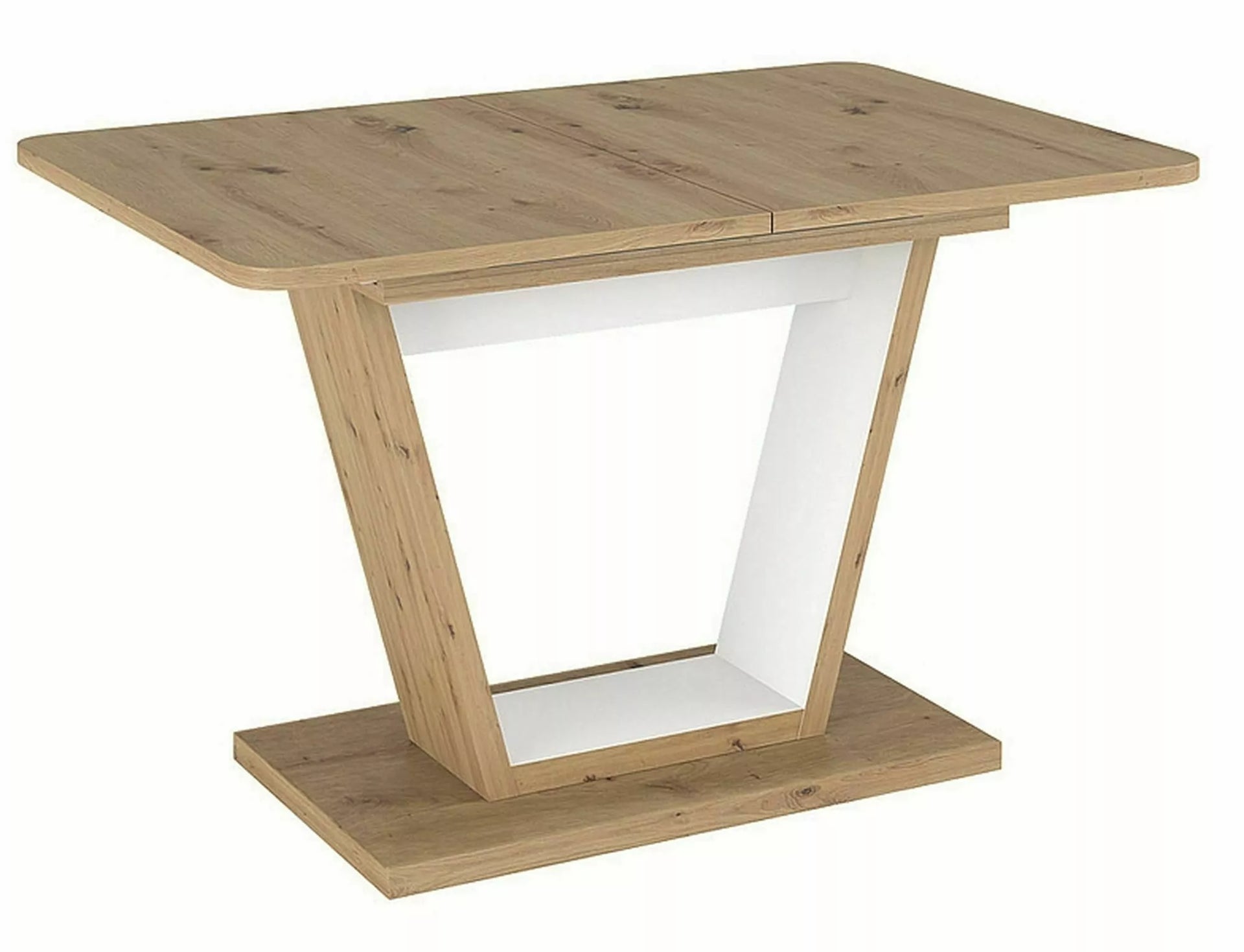 Masa extensibila, blat: placa laminata, cadru: placa laminata, culoare: stejar artizanal + alb mat.