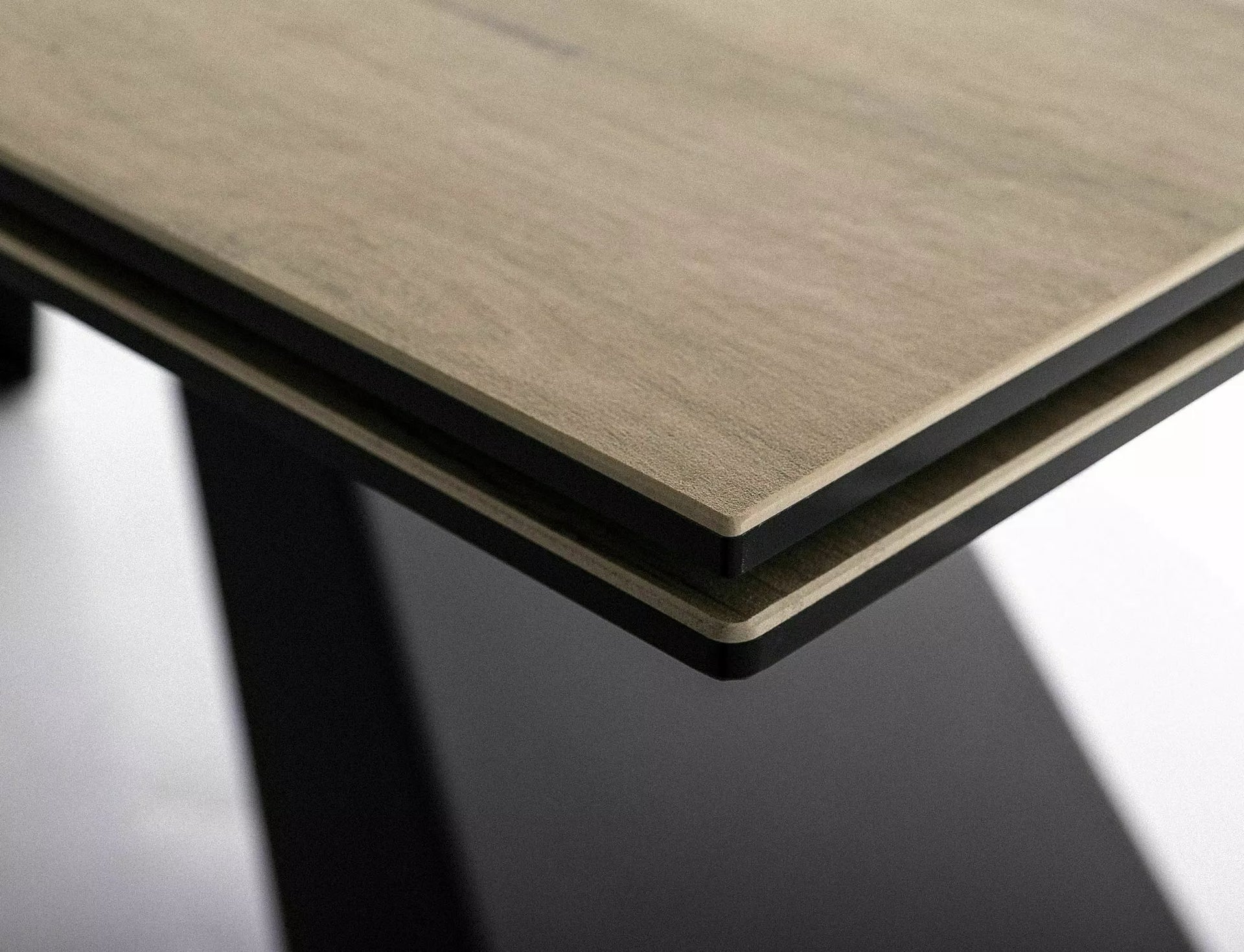 Masa extensibila, blat: sticla securizata + ceramica SABBIA, cadru: metal, culoare: maro deschis mat / negru mat.