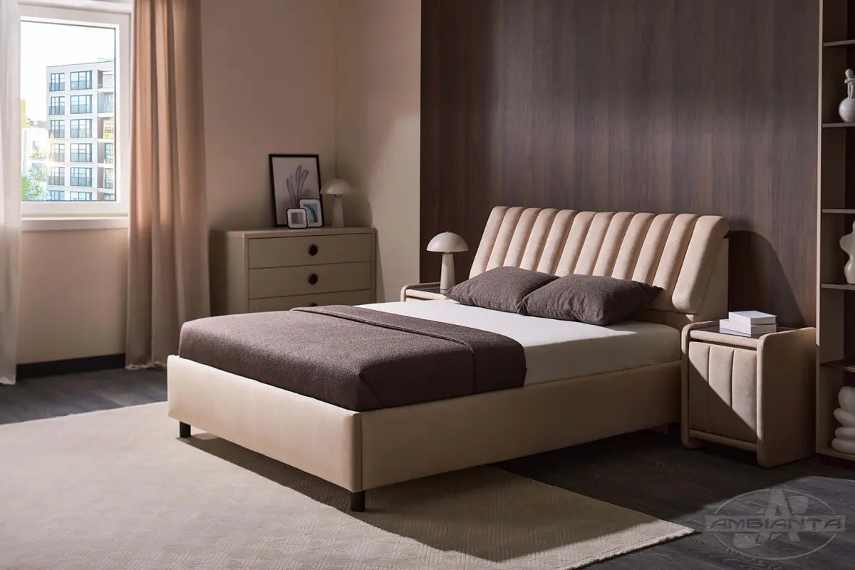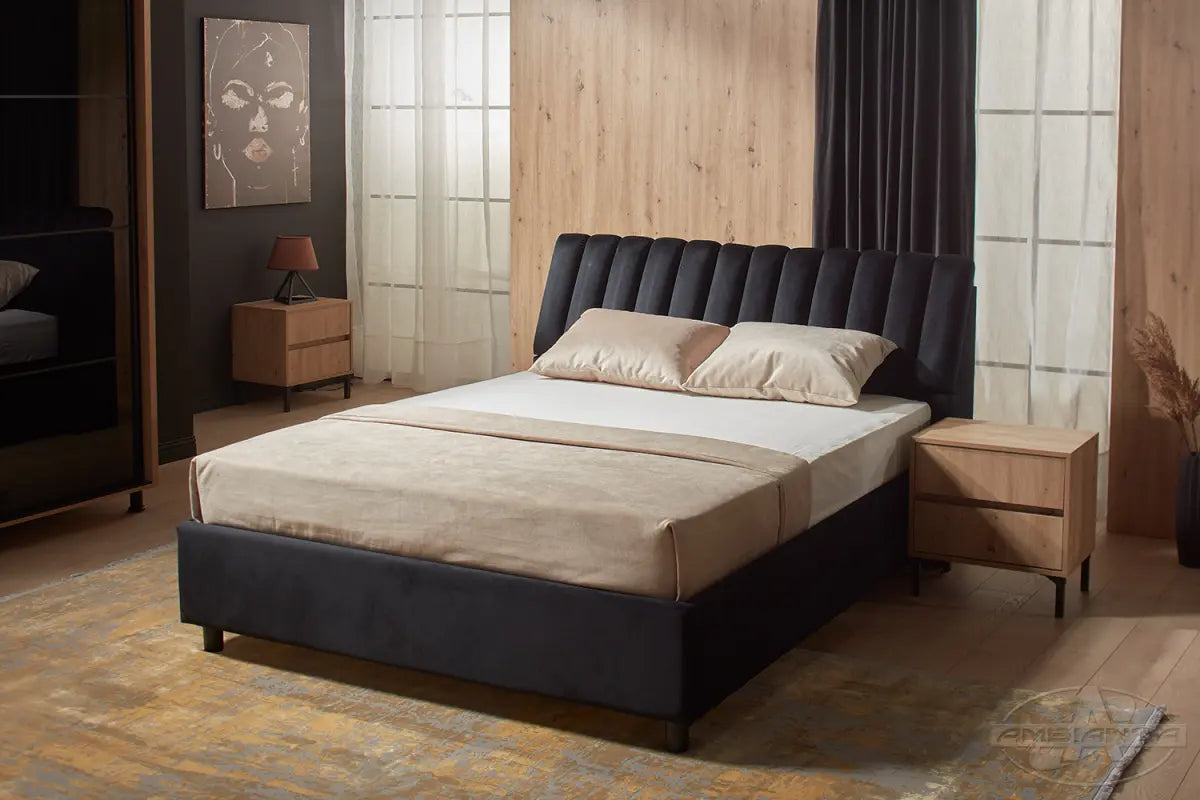 Transformă-ți dormitorul într-un spațiu elegant și funcțional cu acest pat modern, tapițat integral în catifea moale și plăcută la atingere. Designul său rafinat, cu tăblie capitonată și detalii verticale, adaugă un plus de stil și confort.