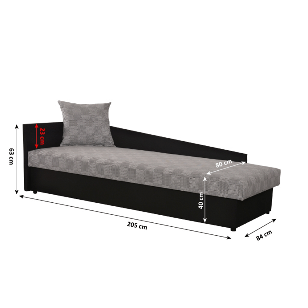 dimensiuni: LxÎxG: 205x63x84 cm, spaţiu pentru dormit: LxL: 80x200 cm, înălţime x adâncimea şezutului: 40x80 cm.