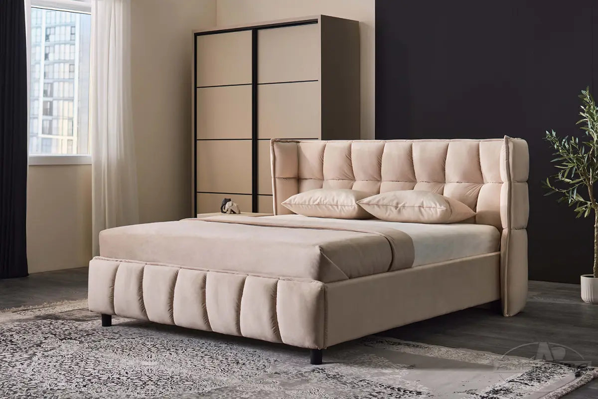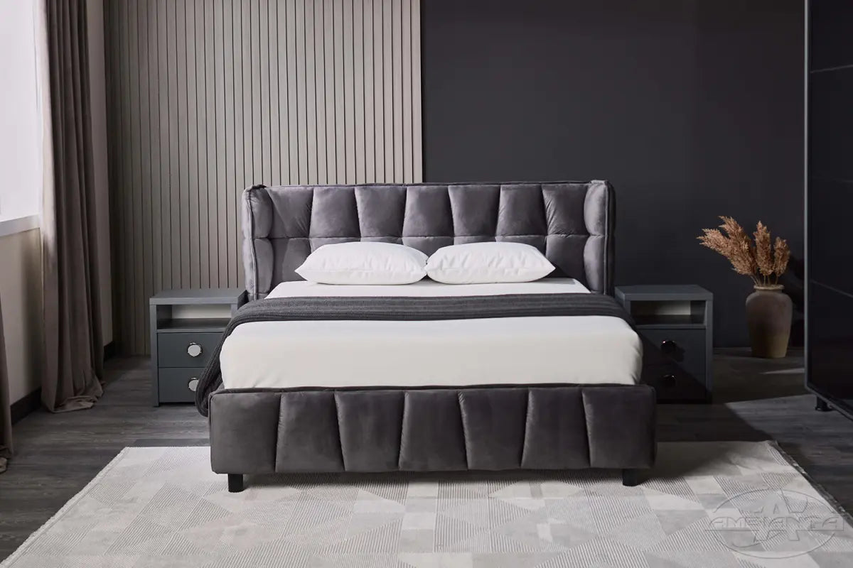 Transformă-ți dormitorul într-un spațiu elegant și funcțional cu acest pat modern, tapițat integral în catifea moale și plăcută la atingere. Designul său rafinat, cu tăblie capitonată și detalii verticale, adaugă un plus de stil și confort.