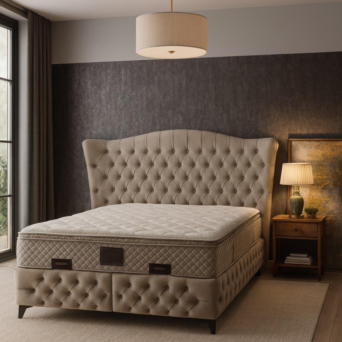 Patul Mabel îmbină designul rafinat cu un confort complet, fiind alegerea ideală pentru un dormitor elegant și practic. Tăblia înaltă, decorată cu nasturi capitonați, oferă un aer sofisticat și un plus de confort pentru momentele de relaxare.