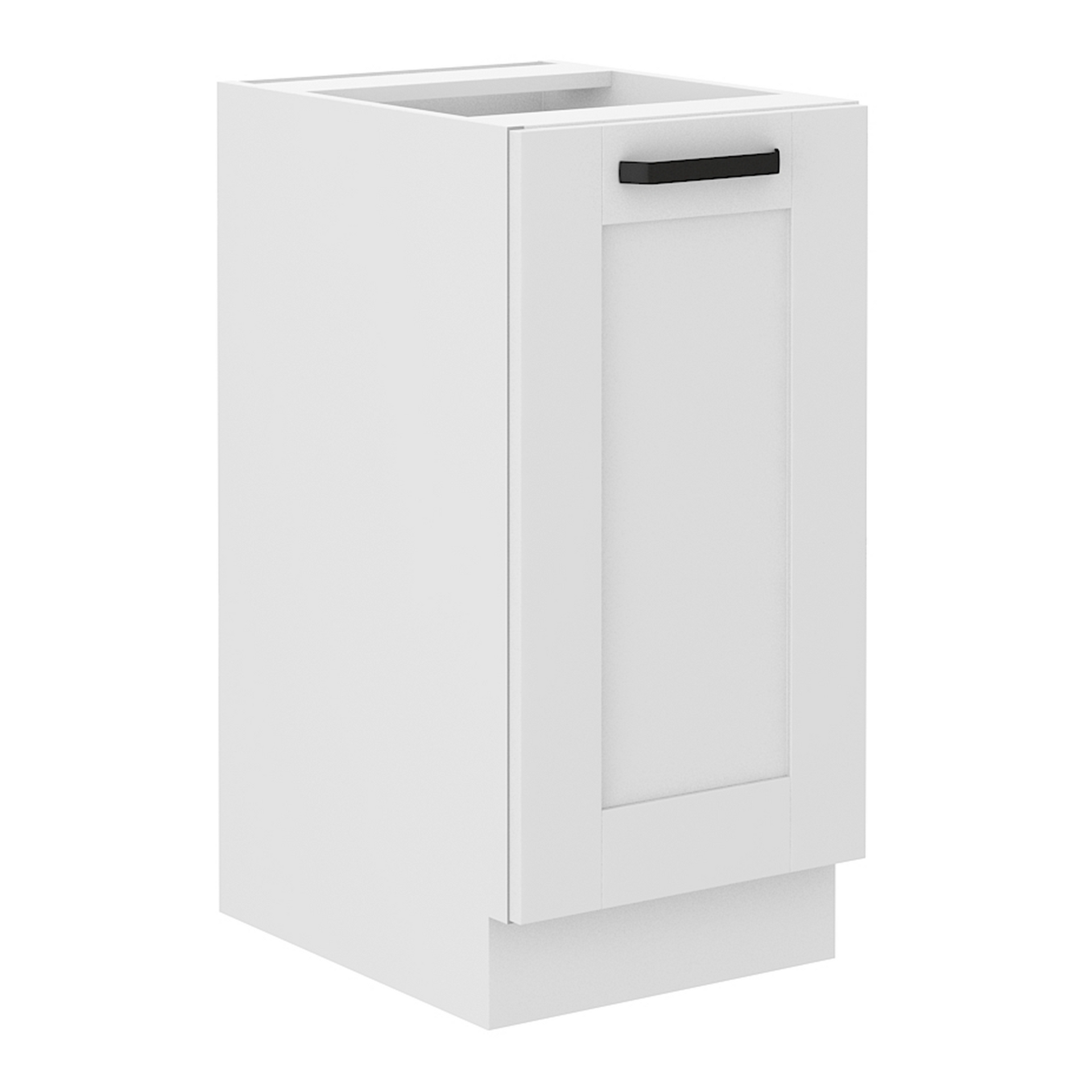 Dulap inferior LULA 40 D 1F BB Material: laminat HDF/MDF Culoare: albă Dimensiuni (LxAxÎ): 40x52x82 cm Grosime material: 1,6 cm Cu uşă, Cu raft, Grosime uşă: 2 cm Cu mâner metalic, Culoarea mânerului: neagră, Fără blat, Design dinamic modern, Livrat dezasamblat, Opţiunea de a cumpăra o chiuvetă universală LAY ON, Dulapurile inferioare sunt furnizate împreună cu şina inferioară, Fără blat de lucru. Opţiunea de a achiziţiona blat de lucru din stejar artisan sau marmură roma la preţul de 319/metru liniar. Opţiunea de a achiziţiona o chiuvetă universală LAY ON.