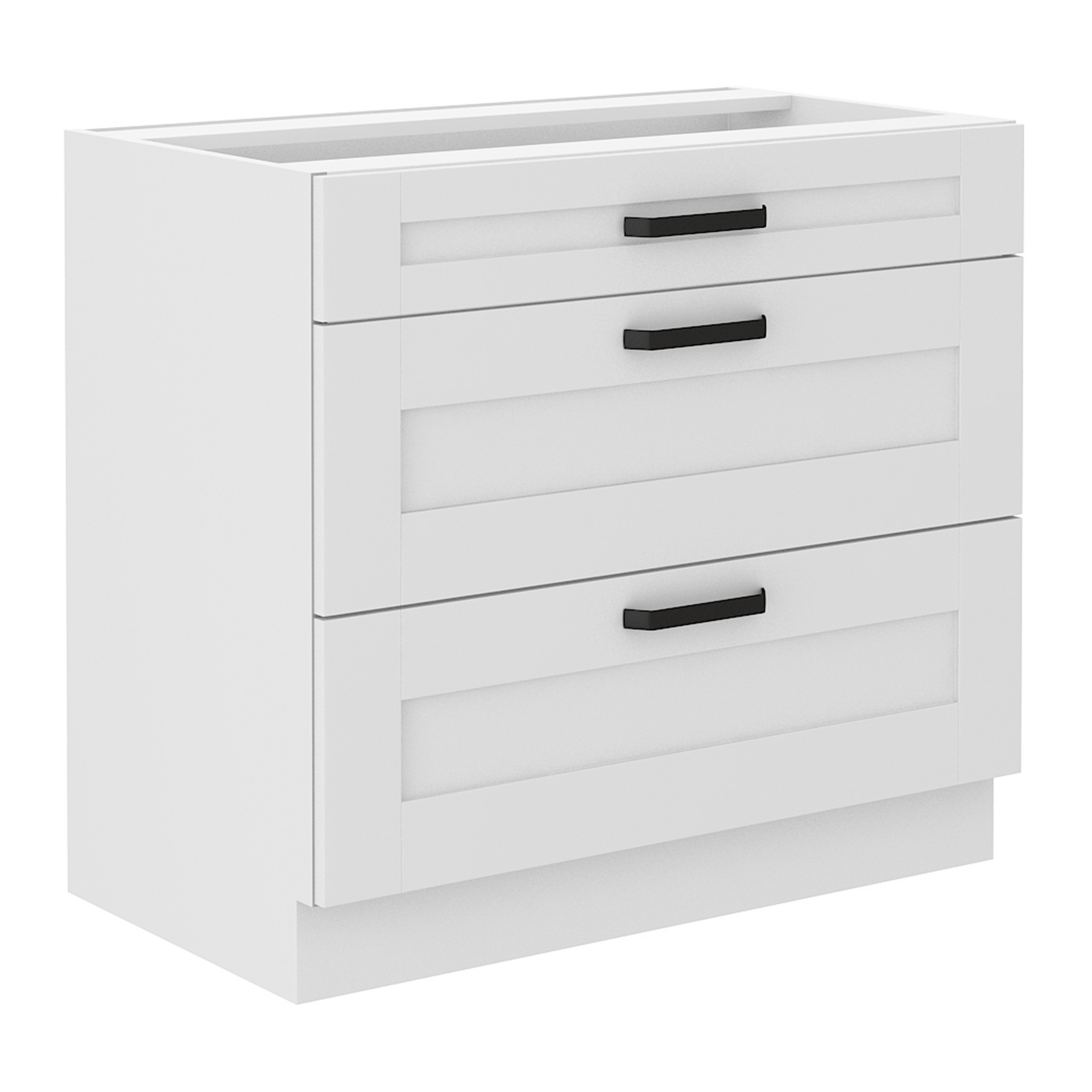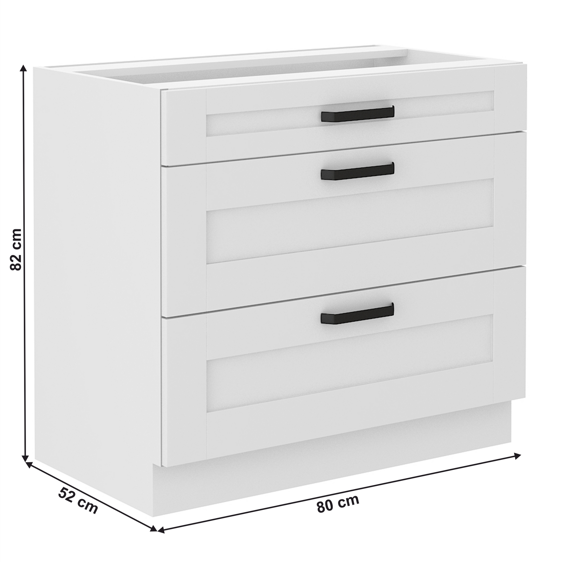 Dulap inferior LULA 80 D 3S BB Material: HDF laminat Culoare: albă Dimensiuni (LxAxÎ): 80x52x82 cm Grosime material: 1,6 cm Cu sertare, 3 sertare, Cu mâner metalic, Culoare mâner: neagră, Cu şină inferioară/plintă, Fără blat de lucru, Design dinamic modern, Se livrează dezasamblat, Opţiunea de a achiziţiona o chiuvetă universală LAY ON, Dulapurile inferioare sunt furnizate împreună cu şina inferioară, Fără blat de lucru. Opţiunea de a achiziţiona blat de lucru din stejar artisan sau marmură roma la preţul de 319/metru liniar. Opţiunea de a achiziţiona o chiuvetă universală LAY ON.