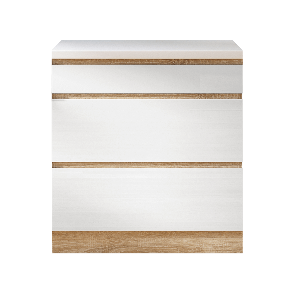 Material şi modelul de culori: PAL melaminat de calitate, de culoare alb extra lucios HIGH GLOSS, corp stejar sonoma.