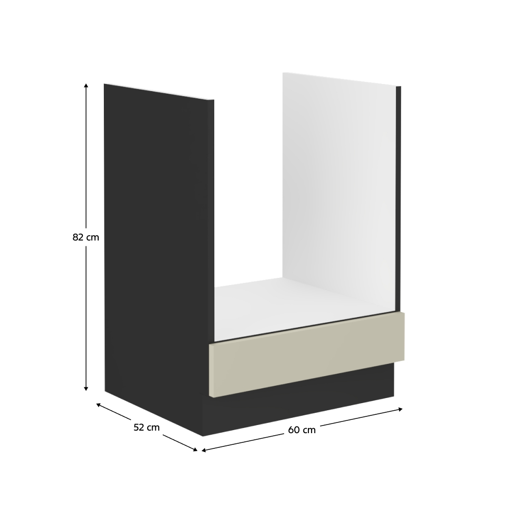 Material: DTD laminat Culoarea uşii: caşmir Culoarea dulapului: negru mat Dimensiuni (Lxlxh): 60x52x82 cm Grosime material: 1,6 cm Dulap fără blat de lucru, Pentru aragaz încorporabil, şina inferioară/plinta inclusă în set,Cu opţiunea de a cumpăra chiuveta universală LAY ON Livrat dezasamblat, Dulapurile inferioare sunt furnizate împreună cu şina inferioară, fără blat. Opţiunea de a achiziţiona blat de lucru din marmură roma la preţul de 339 Lei/ml. Opţiunea de a achiziţiona o chiuvetă universală LAY ON.