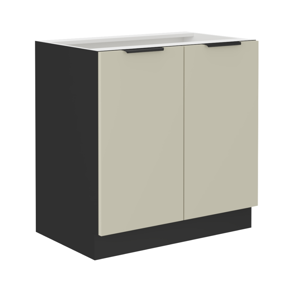 Material: DTD laminat Culoarea uşii: caşmir Culoarea dulapului: negru mat Dimensiuni (Lxlxh): 80x52x82 cm Grosime material: 1,6 cm Cu uşi Cu două uşi, Cu sistem de închidere silenţioasă Cu mâner, Culoarea mânerului: neagră, Design modern, Cu şină inferioară/plintă, Fără blat de lucru, Cu posibilitatea de a achiziţiona chiuveta universală LAY ON, Se livrează dezasamblat, Dulapurile inferioare sunt furnizate împreună cu şina inferioară, Fără blat de lucru.Opţiunea de a achiziţiona blat de lucru din marmură roma la preţul de 339 Lei/ml. Opţiunea de a achiziţiona o chiuvetă universală LAY ON.