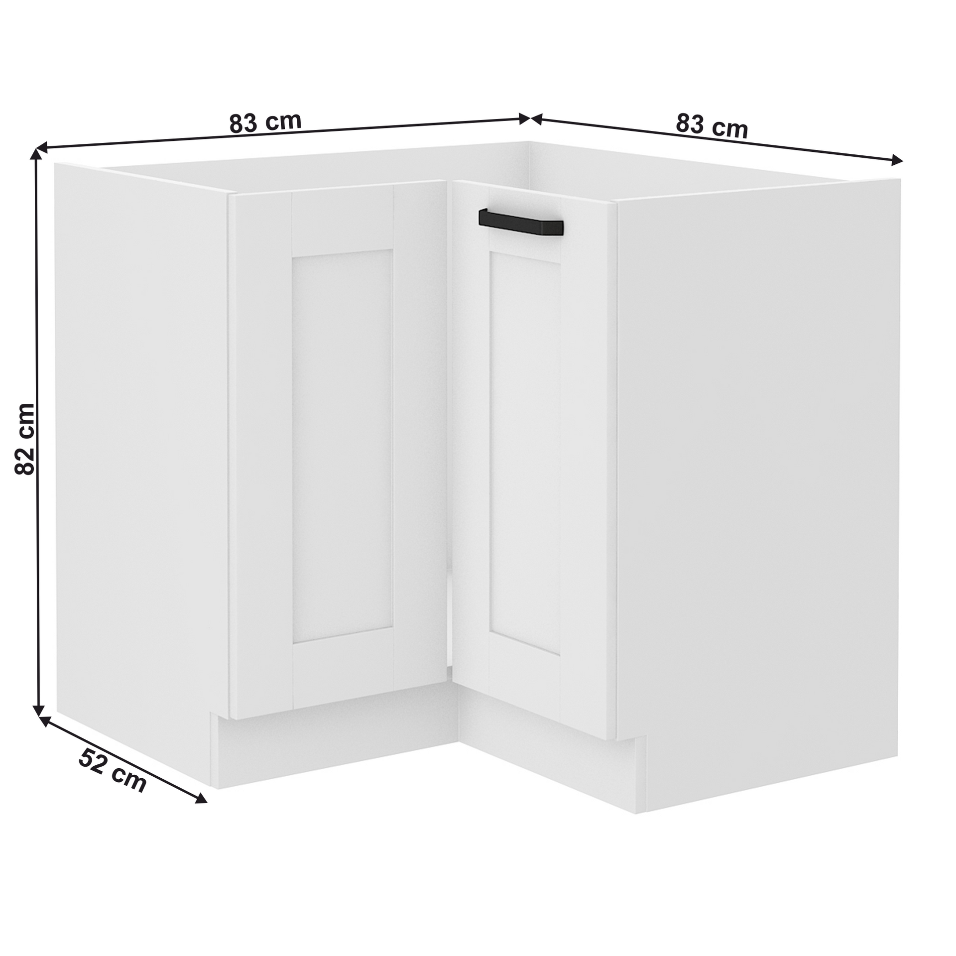 Dulap inferior de colţ LULA 89x89 ND 1F BB Material: laminat HDF/MDF Culoare: albă Dimensiuni (LxAxÎ): 83/83x52x82 cm Grosime material: 1,6 cm Grosime uşă: 2 cm Dulap de colţ, Cu raft, Cu mâner metalic, Culoare mâner: neagră, Sistem de închidere silenţioasă a uşii, Design dinamic modern, Livrat dezasamblat, Dulapurile inferioare sunt furnizate împreună cu şina inferioară, Fără blat de lucru. Opţiunea de a achiziţiona blat de lucru din stejar artisan sau marmură roma la preţul de 319/metru liniar. Opţiunea de a achiziţiona o chiuvetă universală LAY ON.