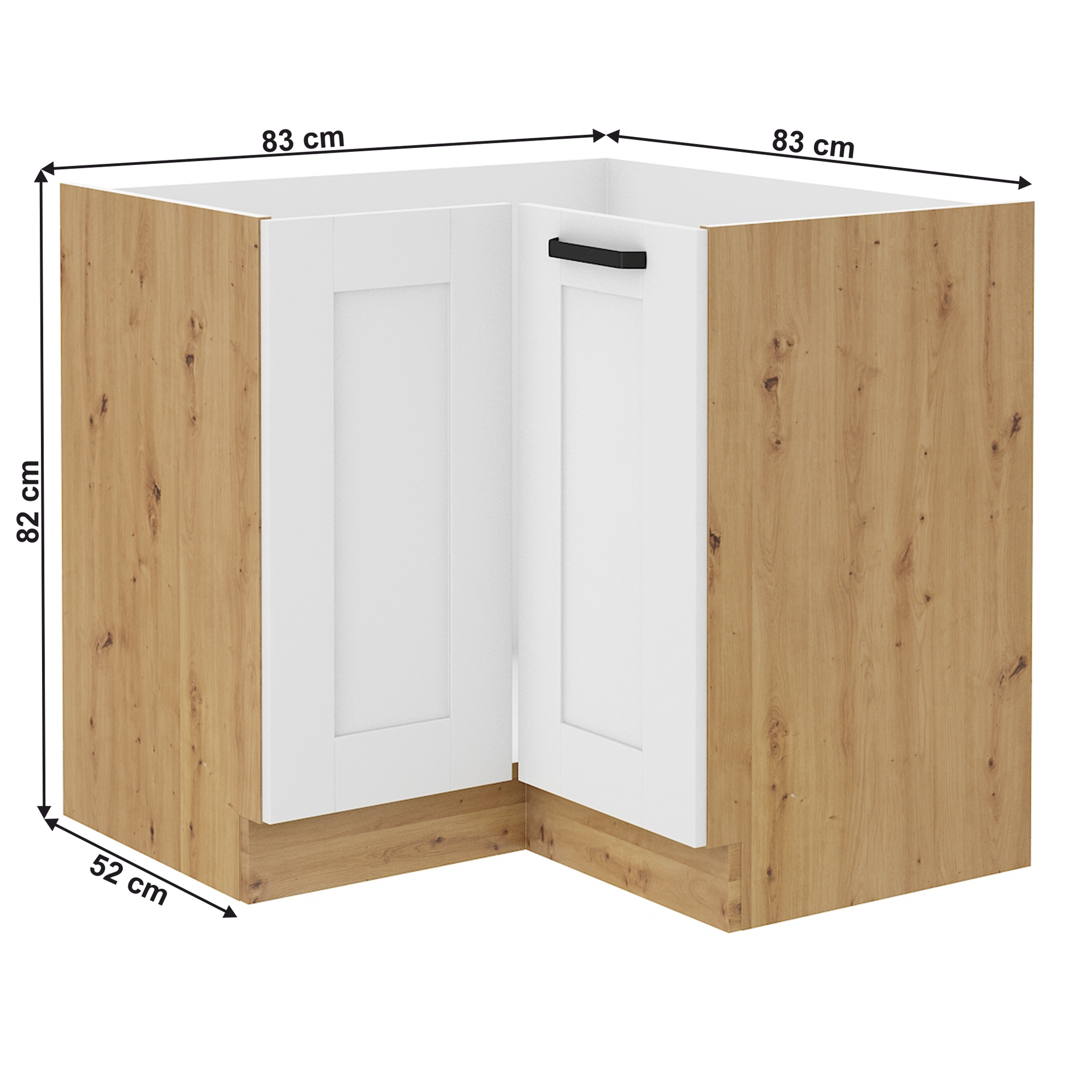Dulap inferior de colţ LULA 89x89 ND 1F BB Material: HDF/MDF laminat Culoare: albă/stejar artisan Dimensiuni (LxAxÎ): 83/83x52x82 cm Grosime material: 1,6 cm Grosime uşă: 2 cm Dulap de colţ, Cu raft, Cu mâner metalic, Culoare mâner: neagră, Sistem de închidere silenţioasă a uşii, Design dinamic modern, Livrat dezasamblat, Dulapurile inferioare sunt furnizate împreună cu şina inferioară, Fără blat de lucru. Opţiunea de a achiziţiona blat de lucru din stejar artisan sau marmură roma la preţul de 319/metru liniar. Opţiunea de a achiziţiona o chiuvetă universală LAY ON.