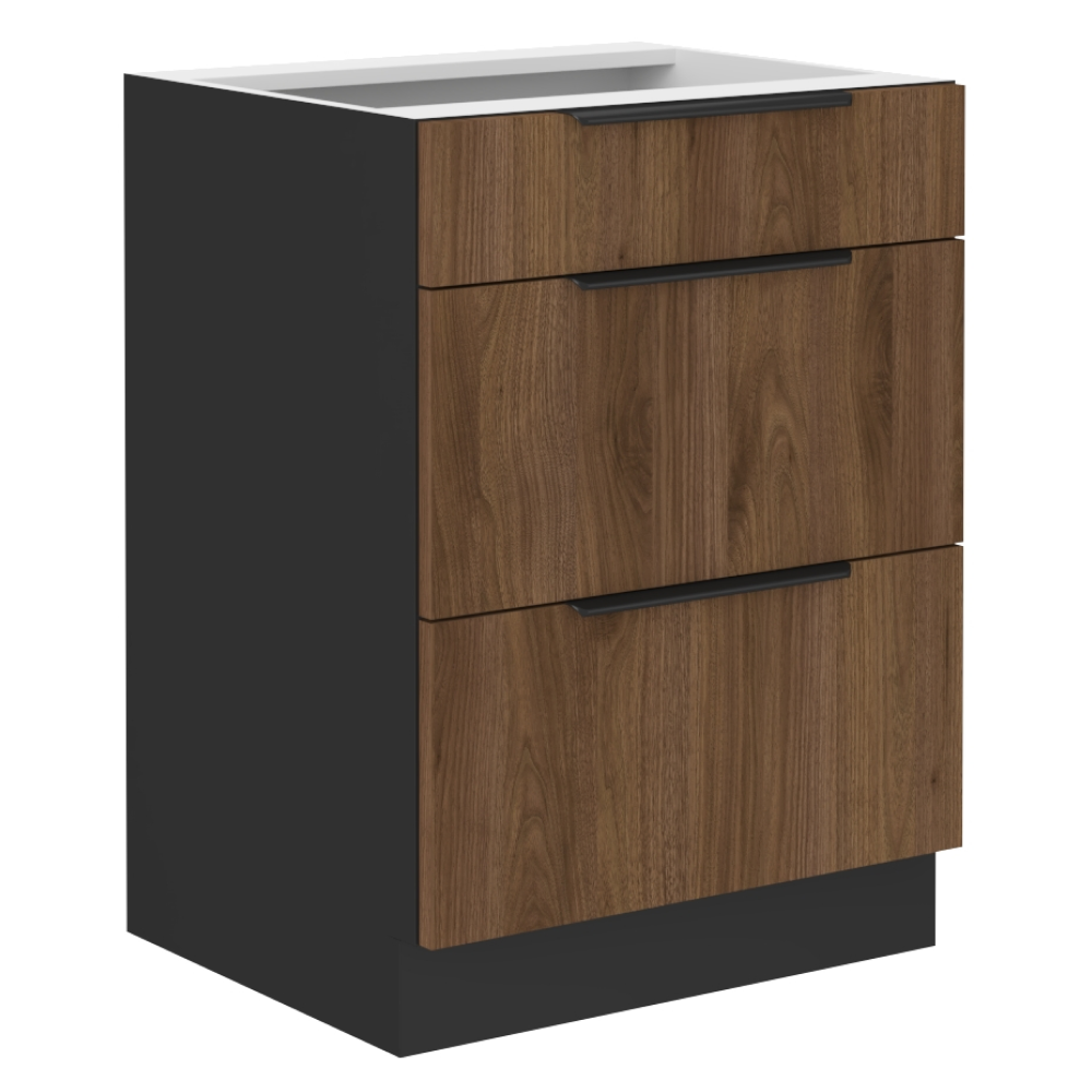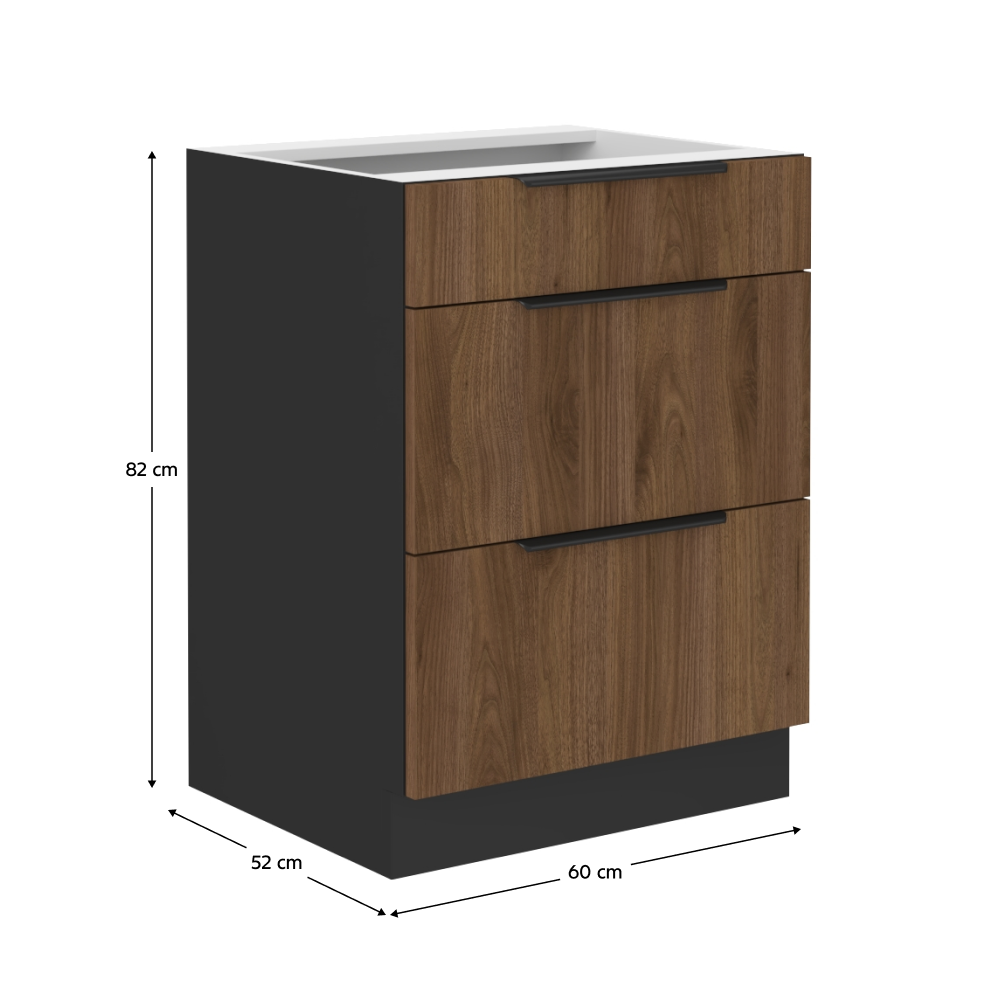 Material: DTD laminat Culoarea uşii: nuc okapi Culoarea dulapului: negru mat Dimensiuni (Lxlxh): 60x52x82 cm Grosime material: 1,6 cm 3 sertare Cu mânere Culoarea mânerului: aluminiu Cu şină inferioară / soclu Fără blat Sistem de oprire silenţioasă a sertarelor Sertar tip PREMIUM-BOX cu laterale din oţel Design modern Se poate achiziţiona chiuvetă universală LAY ON Se livrează dezasamblate Dulapurile inferioare se livrează cu şină inferioară inclusă, fără blat. Opţiunea de a achiziţiona blat de lucru din marmură roma la preţul de 339,-/m. Opţiunea de a achiziţiona o chiuvetă universală LAY ON.