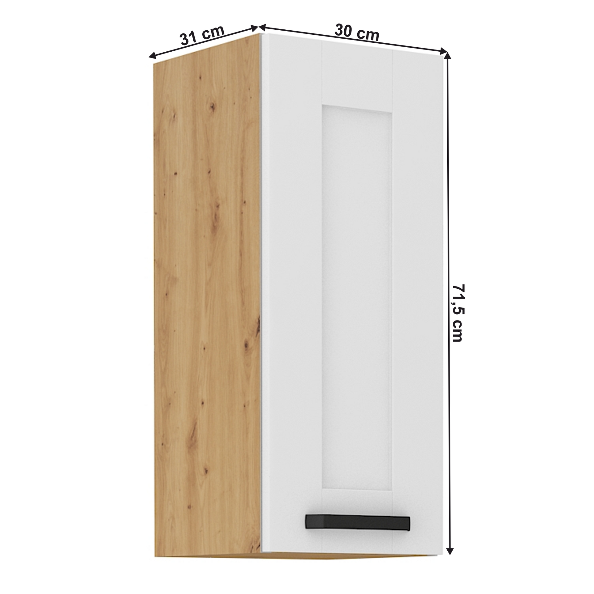 Dulap superior LULA 30 G-721F Material: laminat HDF/MDF Culoare: albă/stejar artisan Dimensiuni (LxAxÎ): 30x31x71,5 cm Grosime material: 1,6 cm Grosime uşă: 2 cm Cu raft, Cu mâner metalic, Culoarea mânerului: neagră, Design dinamic modern, Livrat dezasamblat, Opţiunea de a cumpăra o chiuvetă universală LAY ON, Dulapurile inferioare sunt furnizate împreună cu şina inferioară, Fără blat de lucru. Opţiunea de a achiziţiona blat de lucru din stejar artisan sau marmură roma la preţul de 319/metru liniar. Opţiunea de a achiziţiona o chiuvetă universală LAY ON.