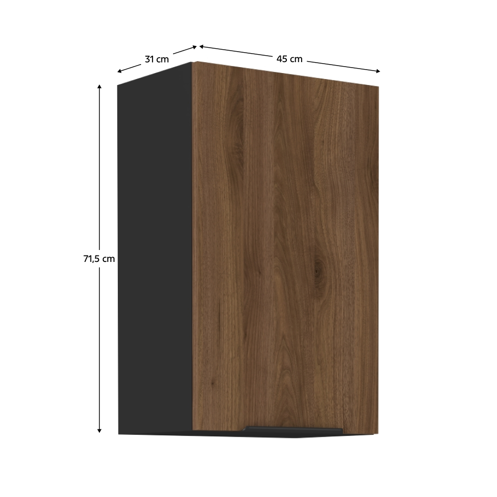 Material: DTD laminat Culoarea uşii: nuc okapi Culoarea dulapului: negru mat Dimensiuni (Lxlxh): 45x31x71,5 cm Grosime material: 1,6 cm Uşă simplă Cu uşă Cu poliţe Cu sistem de închidere silenţioasă a uşii, Cu mâner Culoarea mânerului: aluminiu, Design dinamic modern, Livrat dezasamblat, Dulapurile inferioare sunt furnizate împreună cu şina inferioară, fără blat de lucru. Opţiunea de a achiziţiona blat de lucru din marmură roma la preţul de 339,-/m. Opţiunea de a achiziţiona o chiuvetă universală LAY ON.