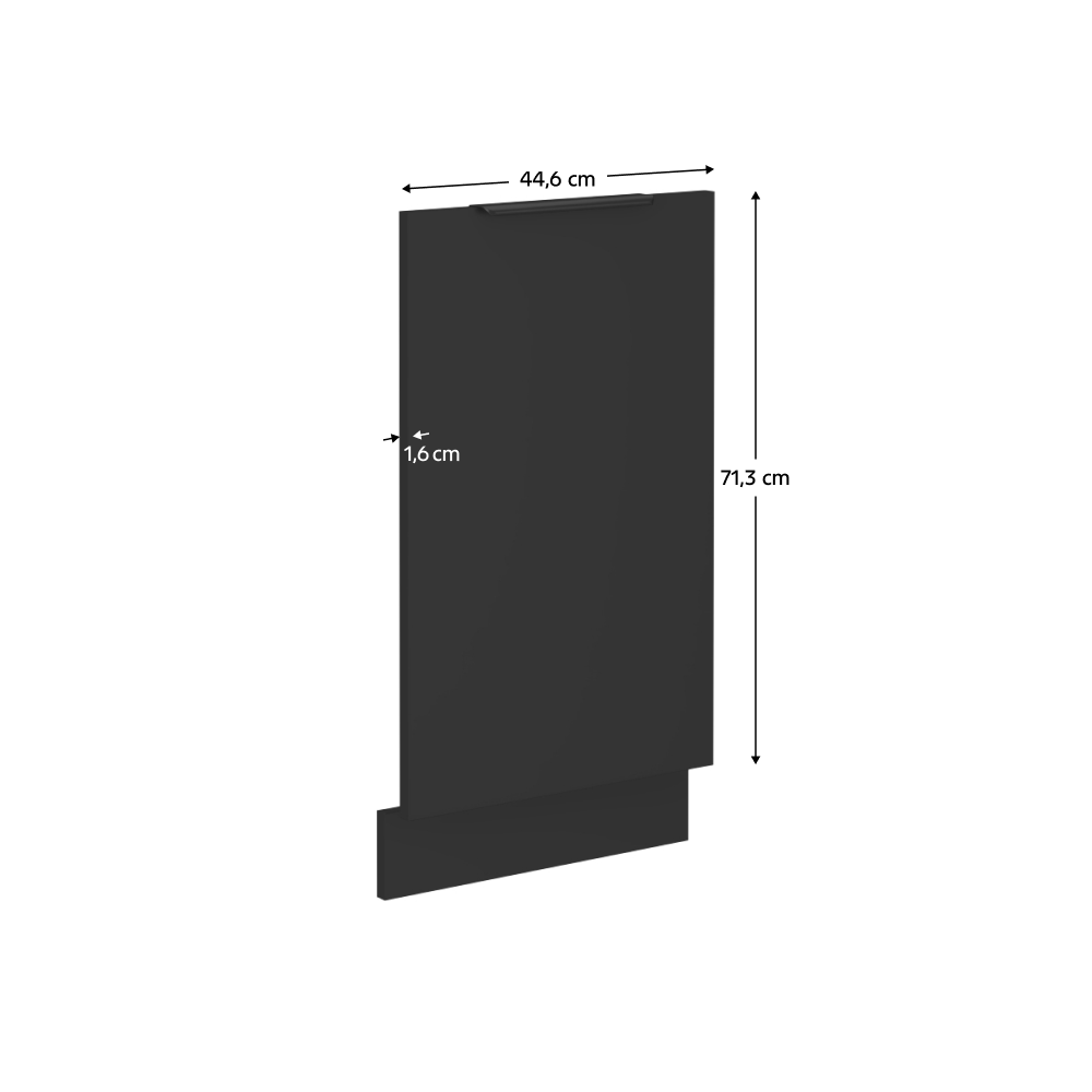 Material: DTD laminat Culoare: neagră Dimensiuni (Lxlxh): 44,6x1,6x71,3 cm Uşă pentru maşină de spălat vase încorporată Cu plintă/soclu Culoarea soclului: negru mat Design modern Cu mâner Culoarea mânerului: aluminiu Se livrează dezasamblate Dulapurile din modularul inferior sunt furnizate inclusiv cu plinta (soclu), fără blat de lucru. Blatul de lucru cu o grosime de 3,8 cm poate fi comandat separat în finisaj de tip stejar artisan la preţul de 339 EUR/ml.