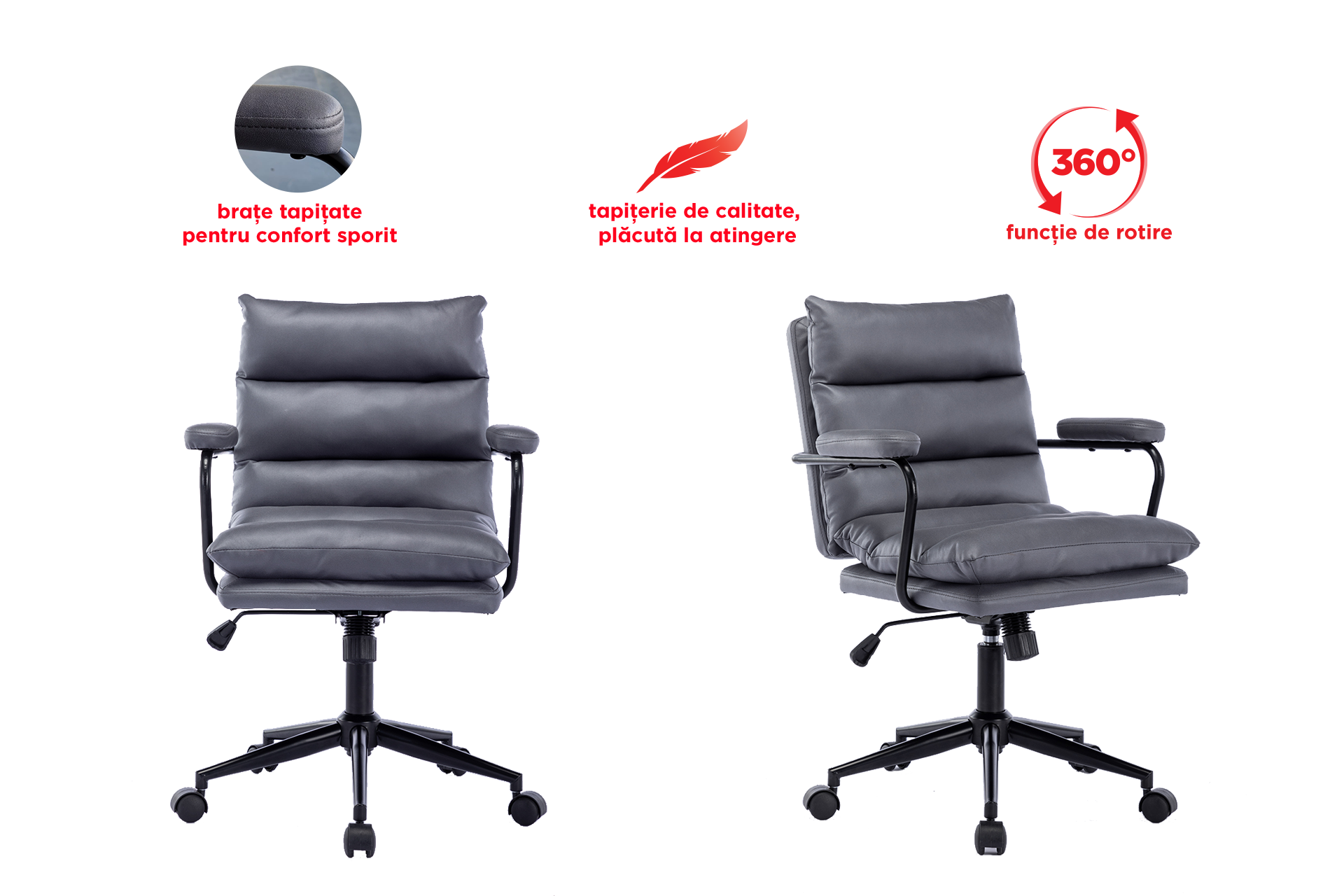 Scaun confortabil, cu format ergonomic perfect pentru o poziție corectă; Brațele sunt tapițate pentru un confort sporit; Dispune de piston pe gaz 100mm pentru reglarea înălțimii; Mobilitatea în spațiul de lucru este asigurată de cele 5 roți ale bazei.