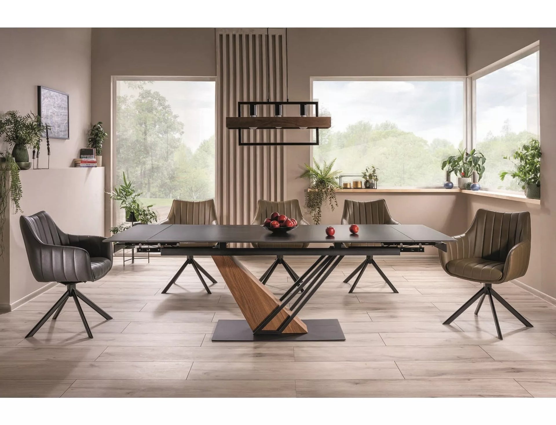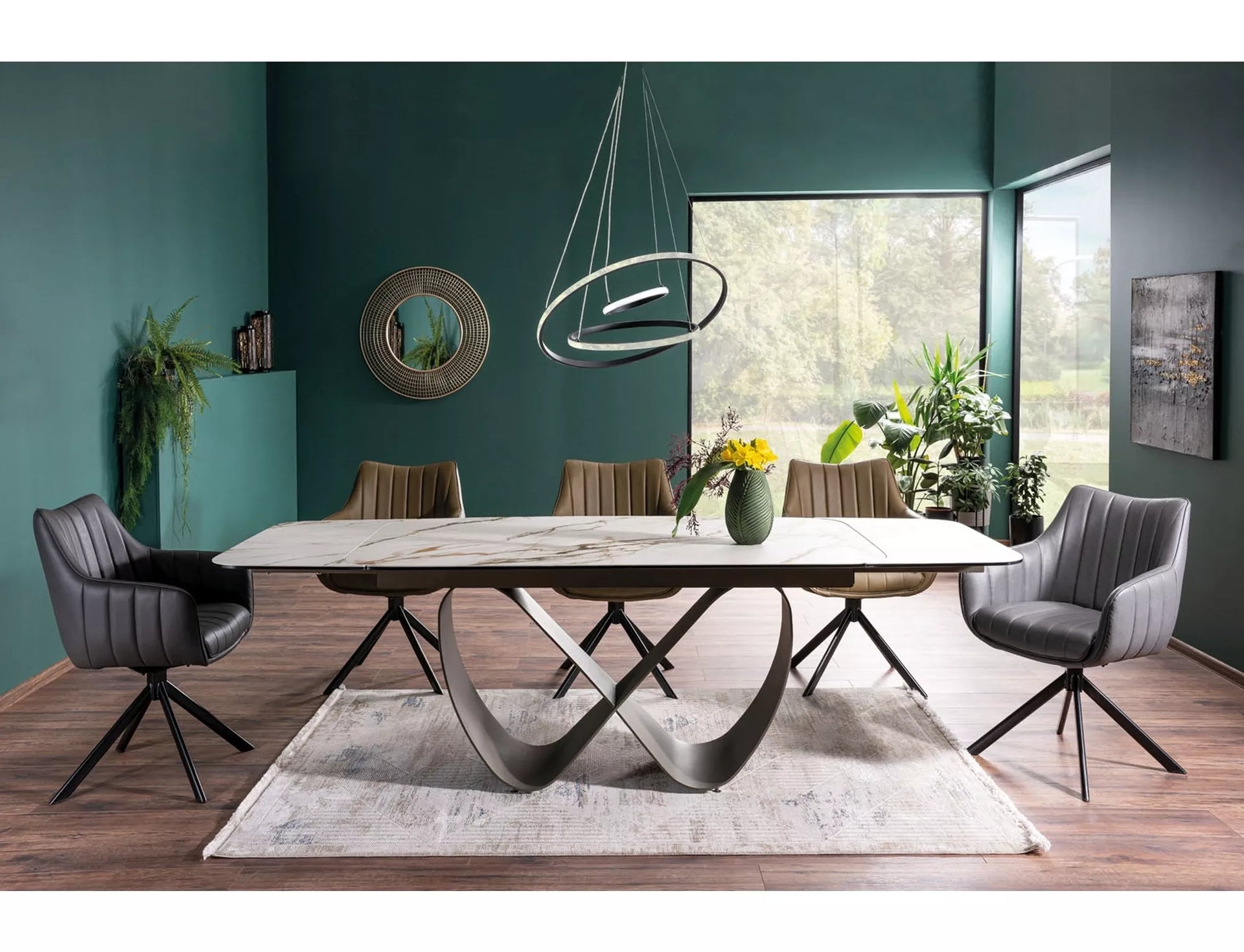 Scaun, piele sintetică, culoare: măsliniu / metal, negru mat. Scaunul poate fi rotit la 180 de grade, cu funcție de întoarcere.