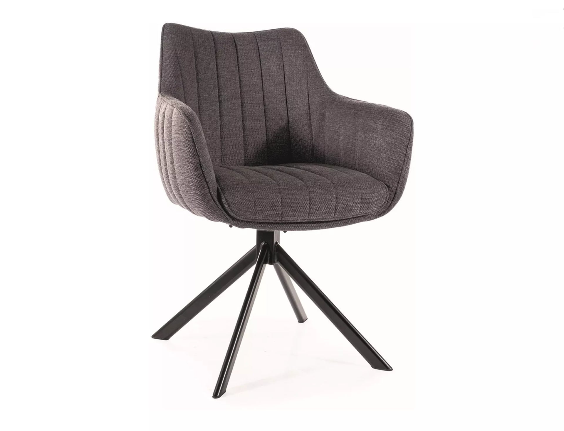 Scaun, material Brego, culoare: gri închis 18, cadru: metal, negru mat. Scaunul poate fi rotit la 180 de grade, cu funcție de revenire la poziția inițială.