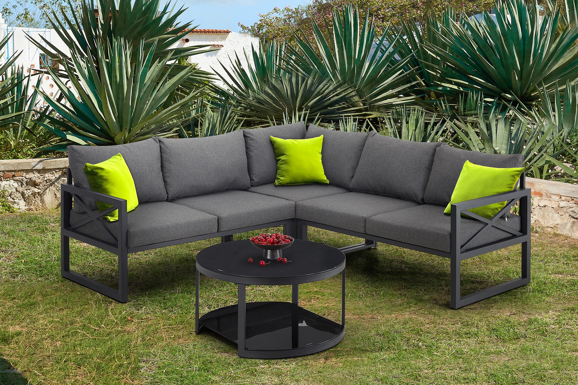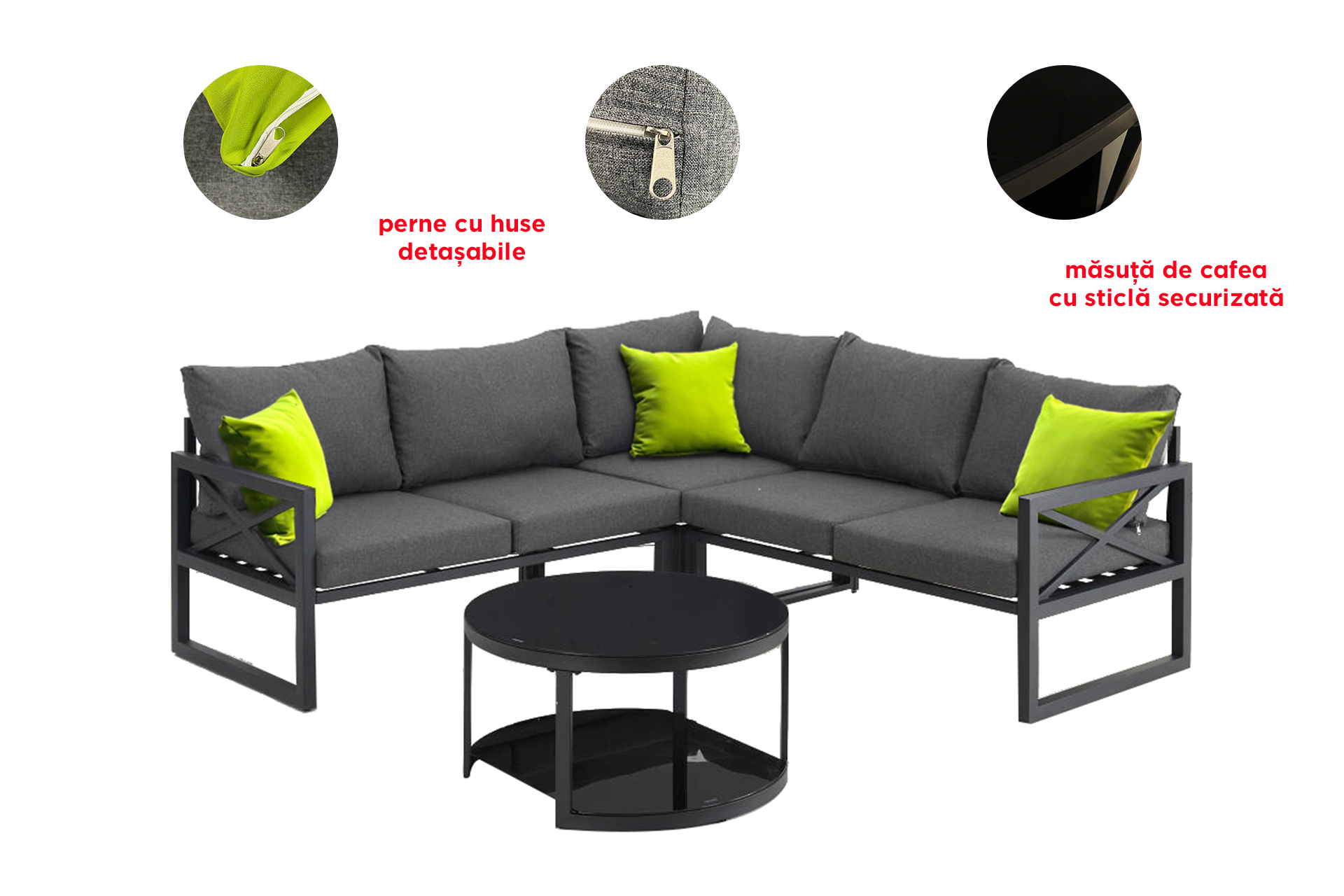 Dotări: 5 perne pentru șezut, 6 perne pentru spătar, din material textil gri antracit, 3 perne decorative cu finisaj verde lime, prevăzute cu fermoar, ușor de curățat.