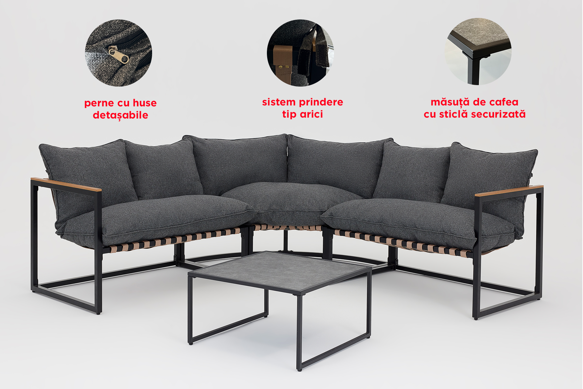 Dotări: sistem de susținere cu chingi, 3 perne pentru șezut, 6 perne pentru spătar, din material textil gri antracit, prevăzute cu fermoar, ușor de curățat, sistem prindere tip arici.