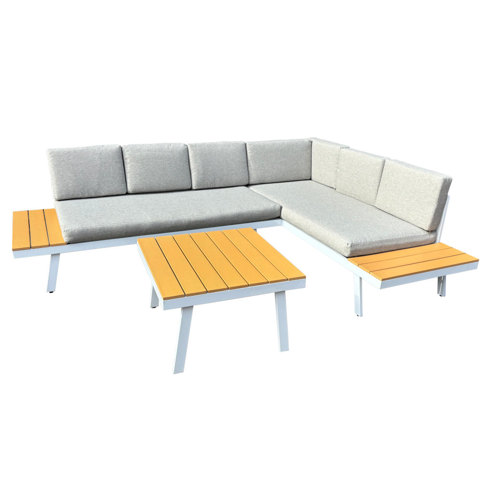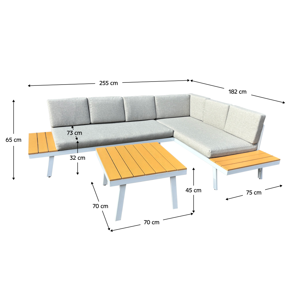 Material: oţel / ţesătură / polywood Rezistenţa ţesăturii conform testului Martindale: 95.000 de cicluri de frecare Culoare: albă / gri deschis / stejar Dimensiuni colţar (LxAxÎ): 255/182x75x65 cm Dimensiunile mesei (LxAxÎ): 70x70x45 cm Înălţime spătar: 13/23 Înălţime scaun: 32 cm Adâncime scaun: 73 cm Capacitate de susţinere per persoană: 90 kg Capacitatea de încărcare a noptierei: 10 kg Grosime pernă: 10 cm Set de 2 piese Colţar Perne incluse în set Huse impermeabile Huse detaşabile Furnizat dezasamblat