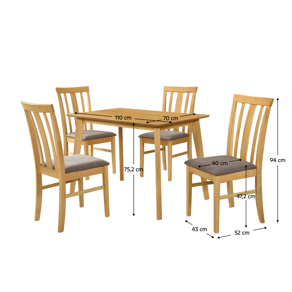 Material: lemn de cauciuc/MDF/furnir/ţesătură Culoare: stejar sonoma deschis/maro închis Dimensiuni masă (Lxlxh): 110x70x75,2 cm Dimensiuni scaun (Lxlxh):43x52x94 cm Înălţimea părţii de şezut: 47,2 cm Adâncimea părţii de şezut: 40 cm Portanţă masă: 100 kg Portanţă scaun: 100 kg Set de sufragerie 1 masă 4 scaune Pentru 4 persoane Livrat dezasamblat