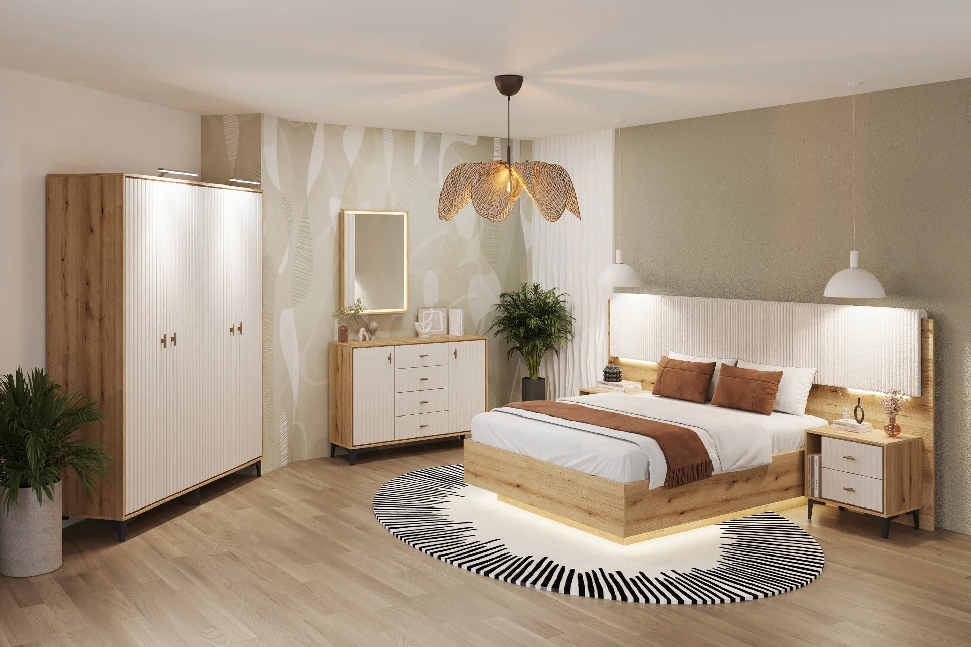 Prețul nu include: comoda, oglinda de perete, salteaua, suportul pentru saltea 160 x 200 cm (din PAL sau somiera), tetierele tapițate, set extensii pentru tăblia patului, sistemul de lumini și elementele de decor.