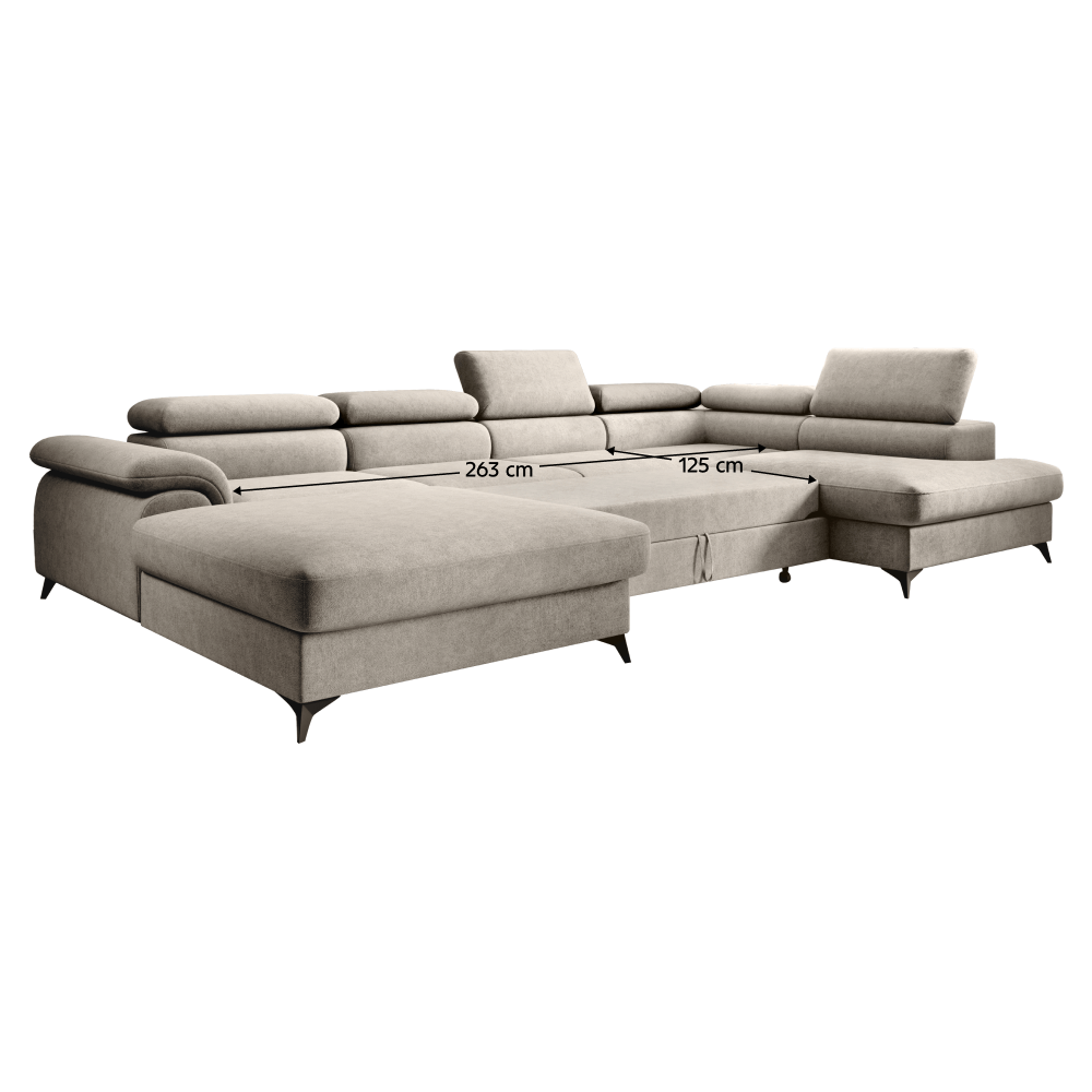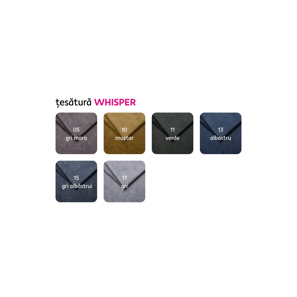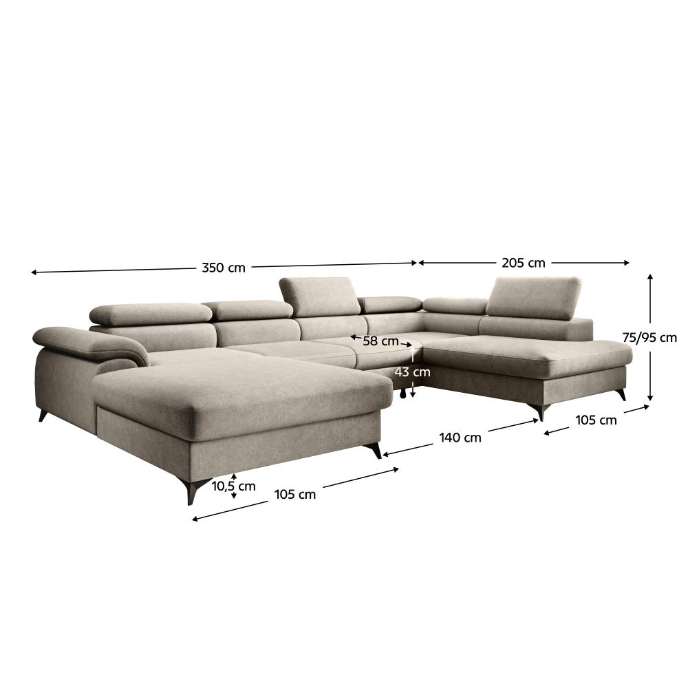 Material: ţesătură Whisper 02 Rezistenţa ţesăturii conform testului Martindale: 100.000 de cicluri de frecare Culoare: bej Dimensiuni (LxAxÎ): 350x205x75/95 cm Suprafaţa pentru dormit (LxL): 125x263 cm Înălţime scaun: 43 cm Adâncime scaun: 58 cm Lăţimea dintre otomane: 140 cm Lăţime otoman: 105 cm Înălţime spătar: 52 cm Cu picioare Material picioare: metal Culoare picioare: neagră Înălţimea compartimentului inferior de la podea: 10,5 cm Umplutură: arcuri ondulate + spumă poliuretanică Extensibilă Tapiţată integral Variantă pentru partea dreaptă În formă de ?U? Colţar Cu spaţiu de depozitare 6 tetiere ajustabile 5 grade de înclinare a tetierelor Livrată dezasamblată Posibilitatea de a alege dintre 6 nuanţe ale ţesăturii Whisper la preţul de 9.799 Lei.. Pentru comenzi personalizate este necesară plata unui avans de 10% din suma totală. După achitarea avansului, comanda dumneavoastră va intra în producţie. Termenul de livrare este de 6-8 săptămâni.