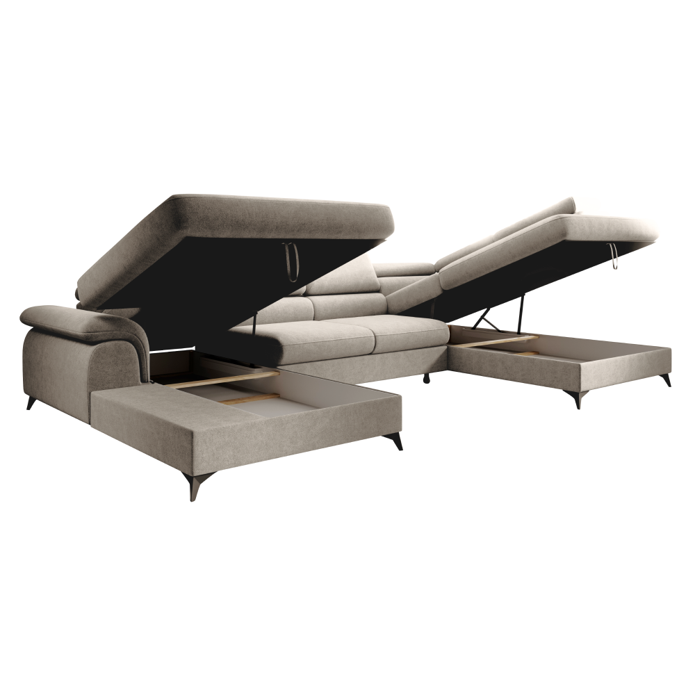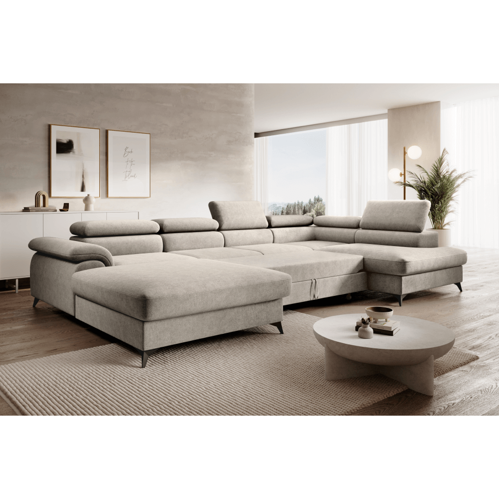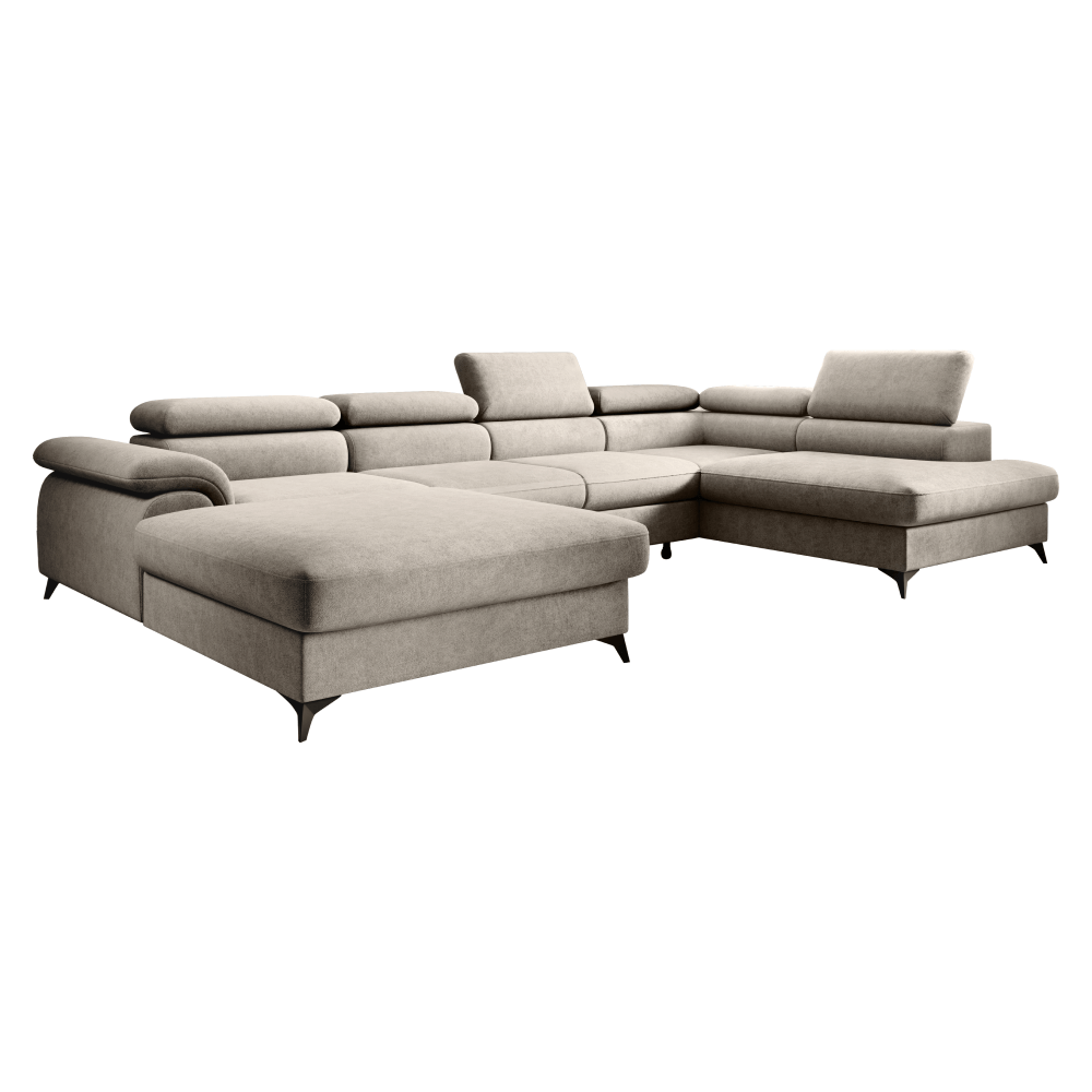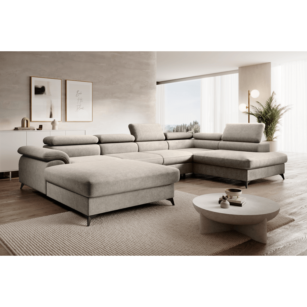 Material: ţesătură Whisper 02 Rezistenţa ţesăturii conform testului Martindale: 100.000 de cicluri de frecare Culoare: bej Dimensiuni (LxAxÎ): 350x205x75/95 cm Suprafaţa pentru dormit (LxL): 125x263 cm Înălţime scaun: 43 cm Adâncime scaun: 58 cm Lăţimea dintre otomane: 140 cm Lăţime otoman: 105 cm Înălţime spătar: 52 cm Cu picioare Material picioare: metal Culoare picioare: neagră Înălţimea compartimentului inferior de la podea: 10,5 cm Umplutură: arcuri ondulate + spumă poliuretanică Extensibilă Tapiţată integral Variantă pentru partea dreaptă În formă de ?U? Colţar Cu spaţiu de depozitare 6 tetiere ajustabile 5 grade de înclinare a tetierelor Livrată dezasamblată Posibilitatea de a alege dintre 6 nuanţe ale ţesăturii Whisper la preţul de 9.799 Lei.. Pentru comenzi personalizate este necesară plata unui avans de 10% din suma totală. După achitarea avansului, comanda dumneavoastră va intra în producţie. Termenul de livrare este de 6-8 săptămâni.