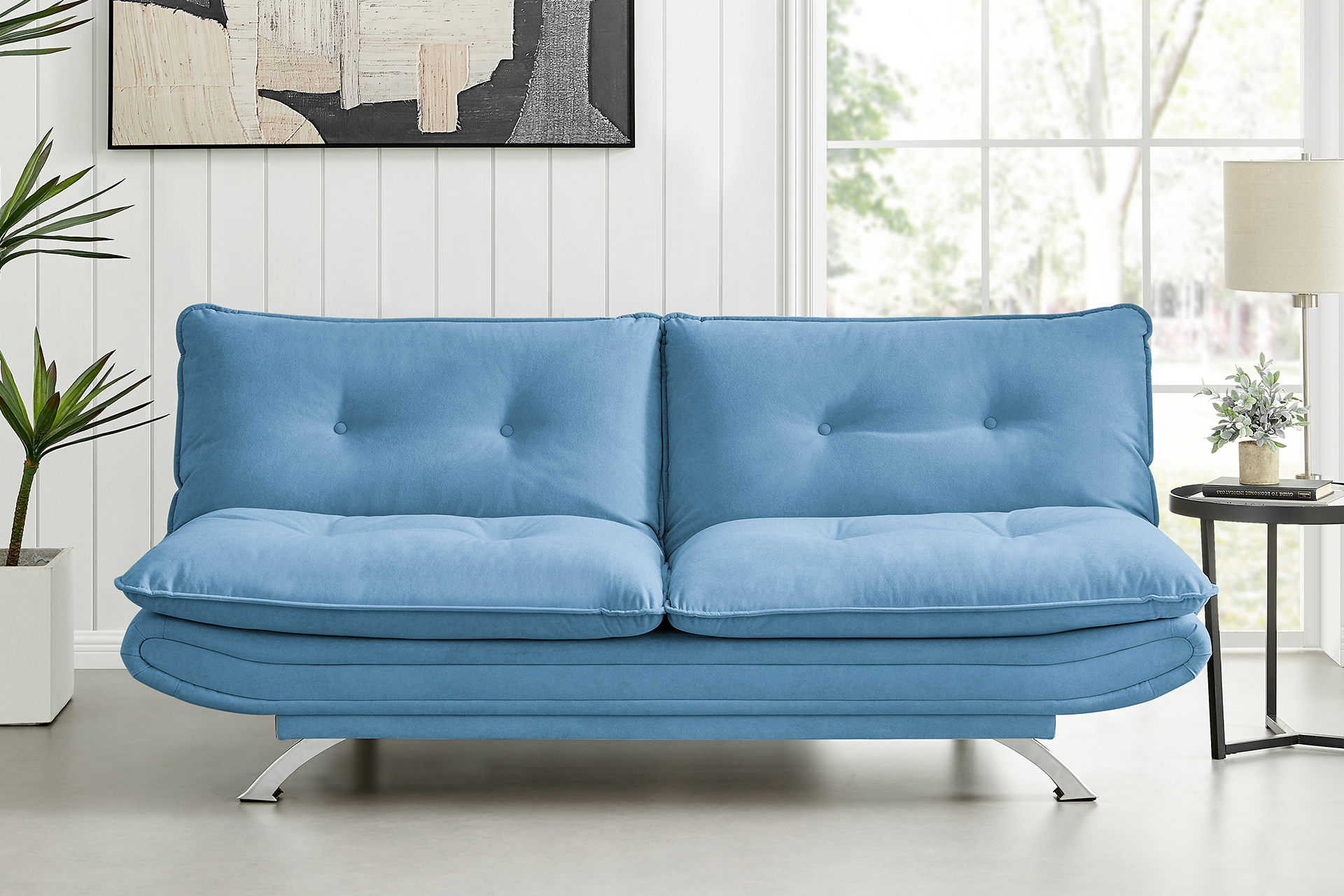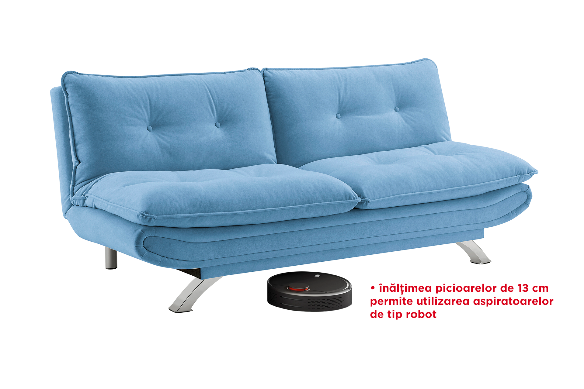 Dotări: mecanism extindere ”click-clack”, picioare frontale cromate, perne aplicate pe spătar și șezut.