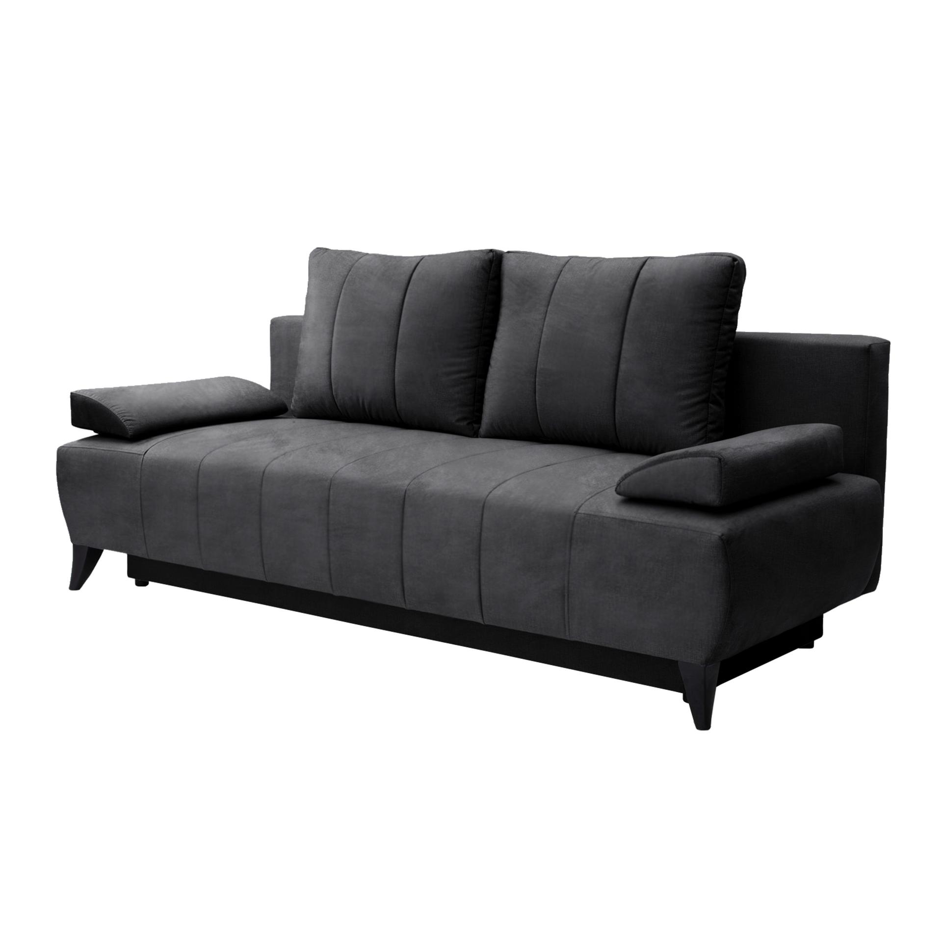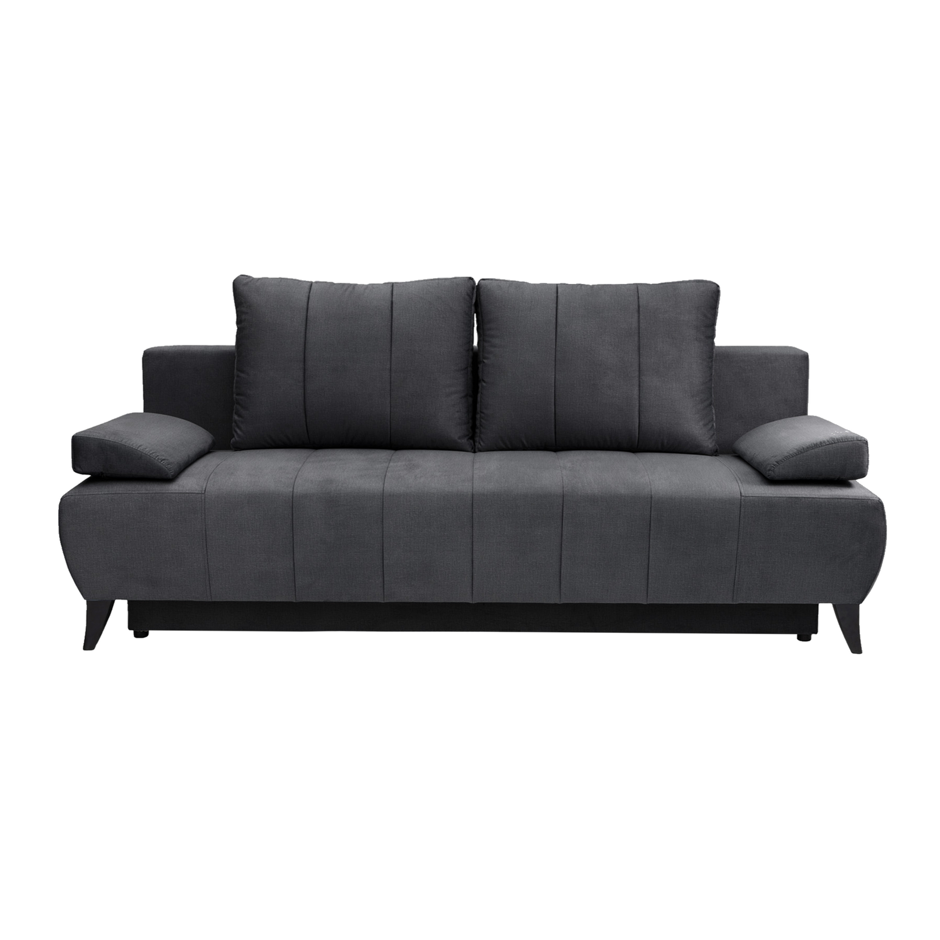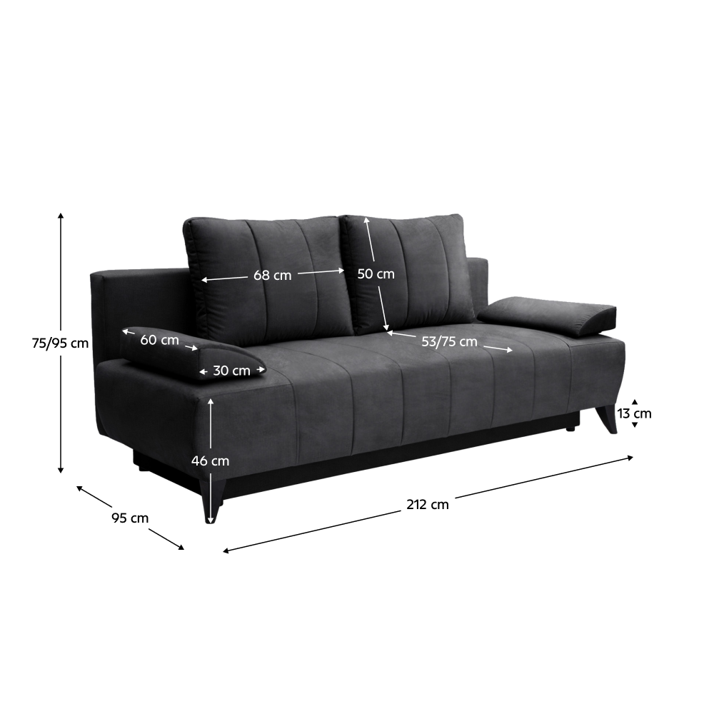 Material: ţesătură Kronos 22 Rezistenţa ţesăturii conform testului Martindale: 60.000 de cicluri Culoare: gri Dimensiuni (LxAxÎ): 212x95x75/95 cm Înălţime scaun: 46 cm Adâncime scaun: 53/75 cm Suprafaţa pentru dormit (LxL): 212x140 cm Picioare din plastic Culoare picioare: neagră Înălţimea spaţiului inferior de la podea: 13 cm Umplutură: arcuri de oţel + spumă poliuretanică, Tapiţată integral, Extensibilă, Cu spaţiu de depozitare, 2 perne mari şi 2 mici, Dimensiuni perne mari (LxL): 50x68 cm Dimensiuni perne mici (LxL): 60x30 cm Capacitatea de susţinere per persoană: 90 kg Cusături decorative practice moderne Se livrează dezasamblat