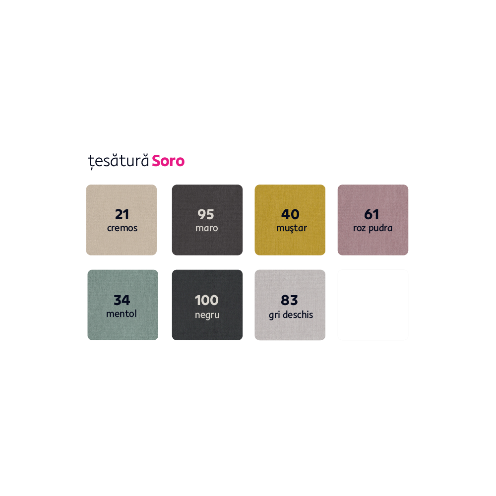 Poate fi comandat în 7 culori de ţesătură Soro, cu o alegere de lemn de nuc sau fag în preţ: canapea - 1 149,-, fotoliu - 2 279,-. Pentru comenzi individuale, este necesar un depozit de 10% din suma dată. După plata avansului, cererea dumneavoastră va fi introdusă în producţie. Timpul de livrare 6-8 săptămâni.